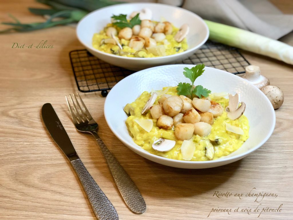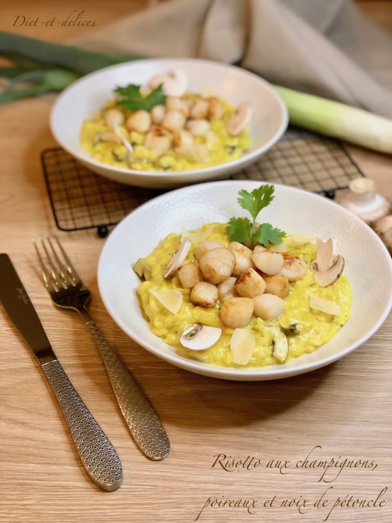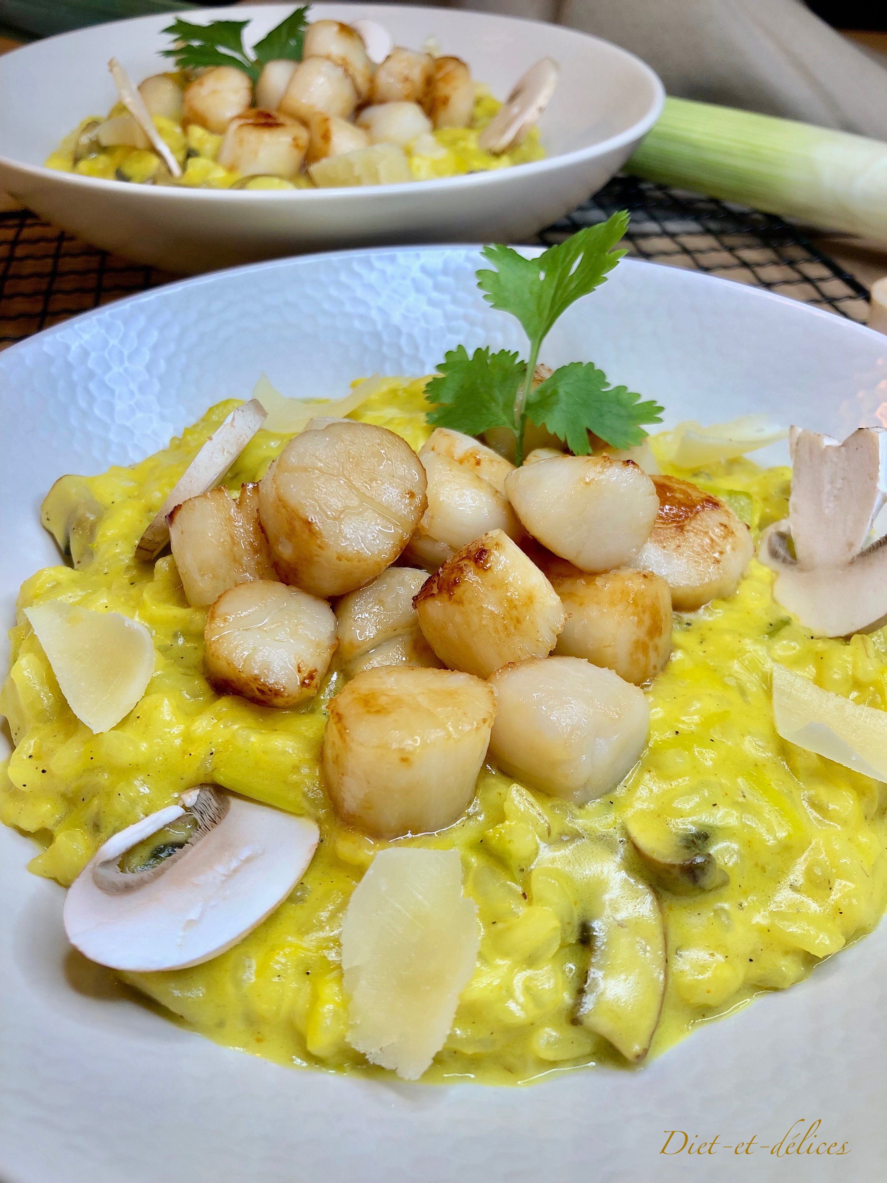 risotto, pétoncles, noix de pétoncles, champignons, poireaux, curry