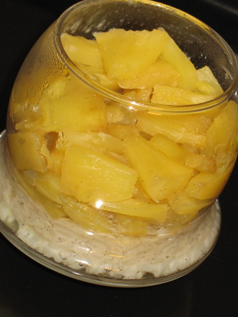 – Lors de la cuisson de l’ananas vous pouvez remettre la gousse de vanille qui a été utilisée pour le riz au lait.