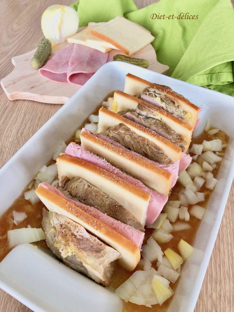 • Alterner une tranche de viande, une tranche de fromage à raclette fumé, une demie tranche de jambon. Continuer ainsi jusqu’à l’épuisement des ingrédients.