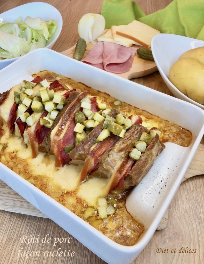 rôti, rôti de porc, porcrôti façon raclette, fromage à raclette, raclettecornichons, jambon blanc, viande rouge