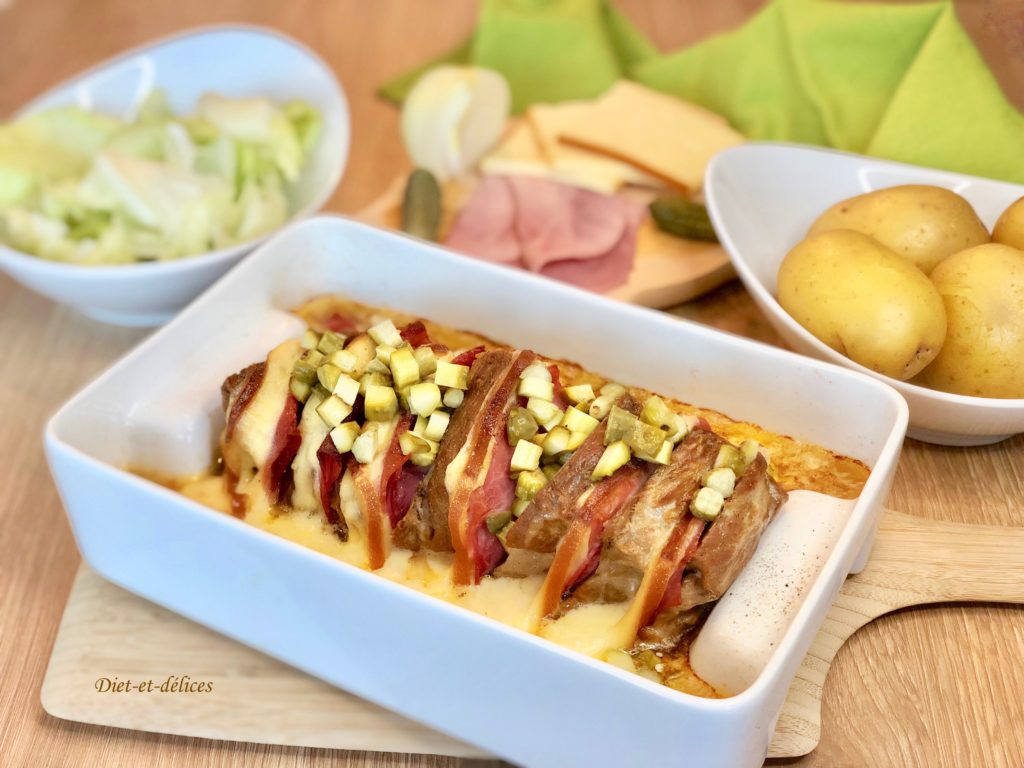 Une recette originale avec le fromage à raclette, cette recette est vraiment appétissante. Je trouve l’ajout des cornichons super sympa, cela donne du croquant au plat.