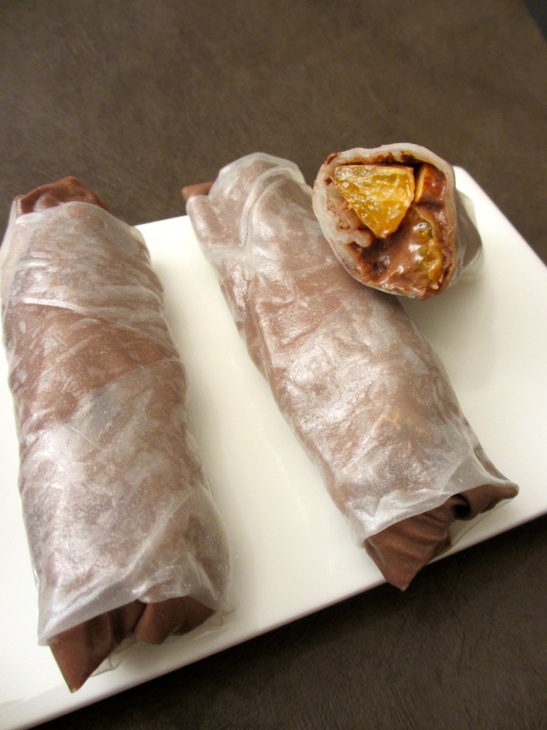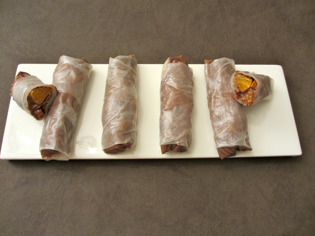 rouleau de printemps, nem, plat asiatique, mandarine, chocolat, dessert , clémentines, fromage blanc, sauce chocolat, bouchées, feuilles de riz, dessert rapide