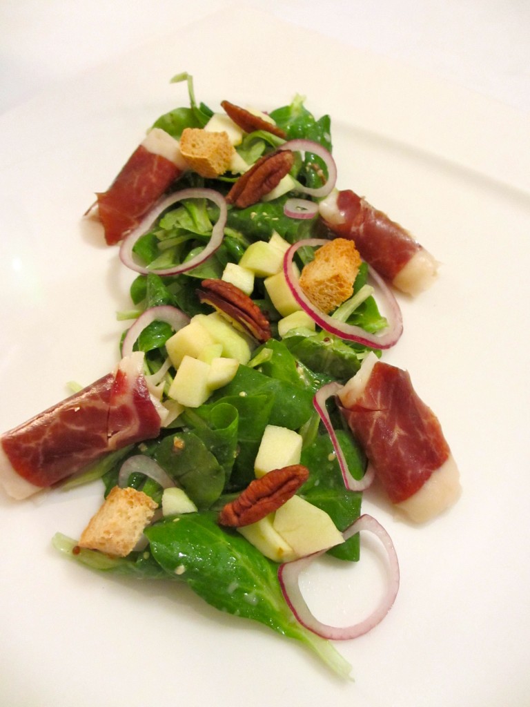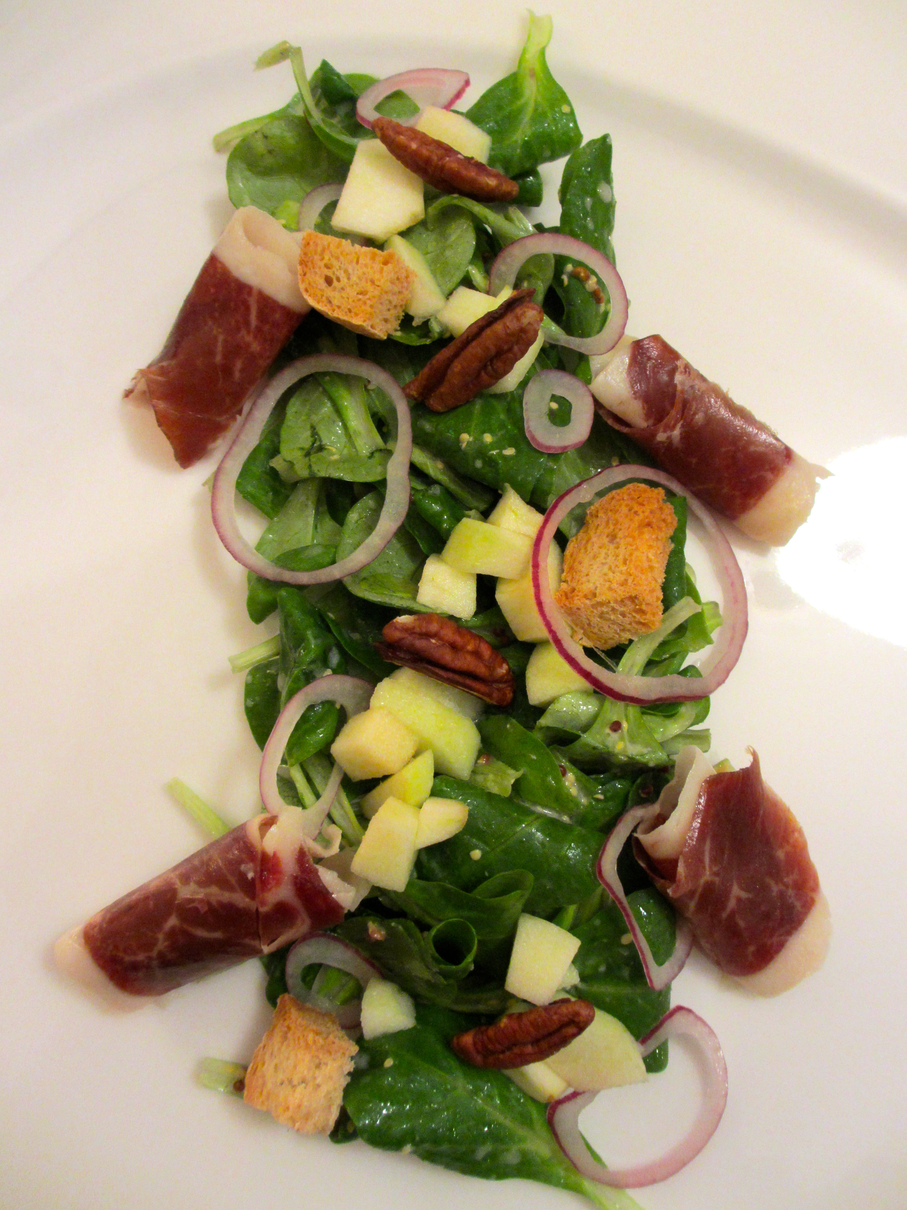 salade, salade automnale, mâche, salade de mâche, jambon, jambon ibérique noix de pécan,oignon, accompagnement, pomme, moutarde, vinaigrette