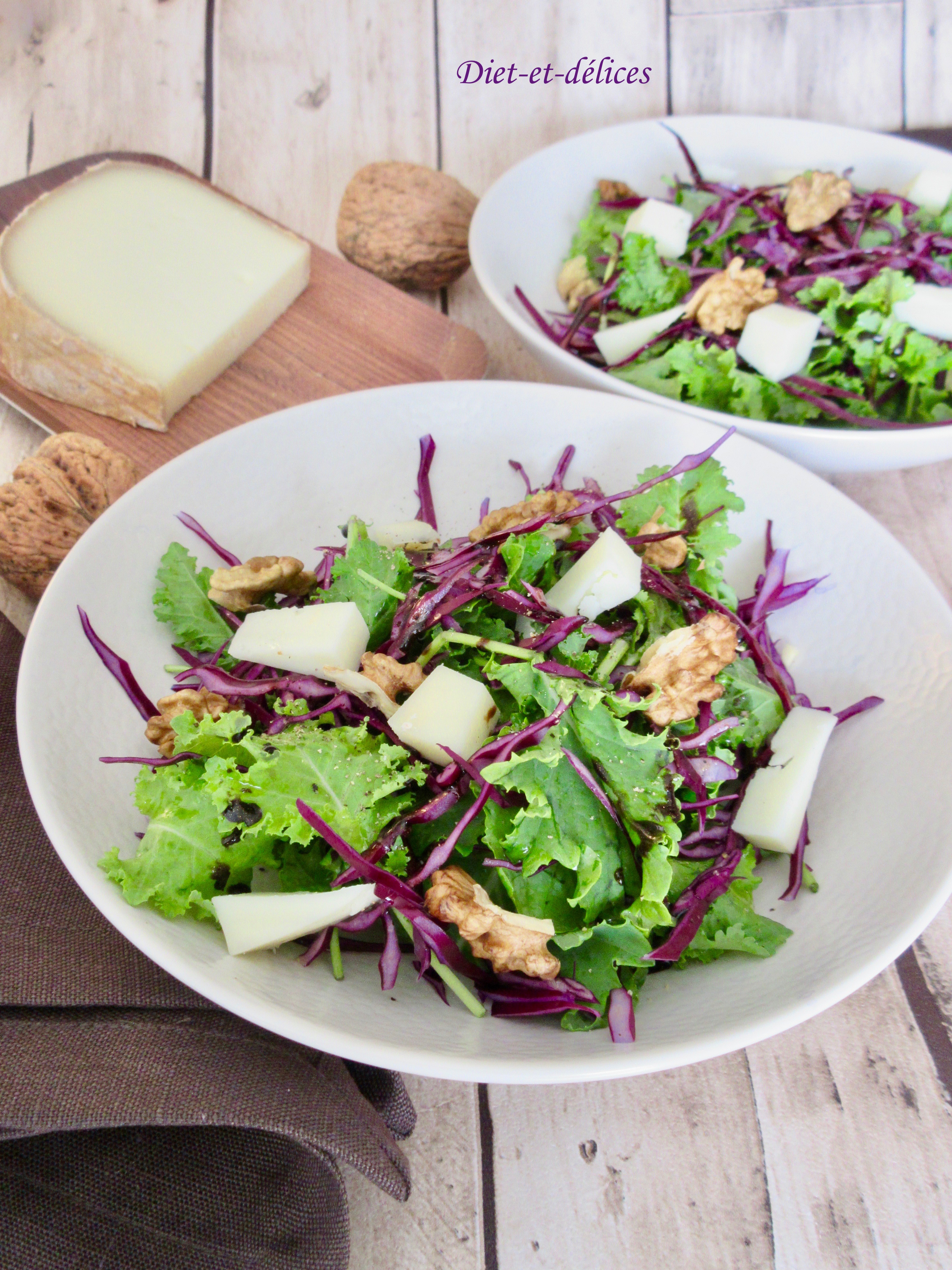 végétarien, salade, chou kale, chou rouge, jeunes pousses de chou kale, ossau iraty, huile de noix, noix