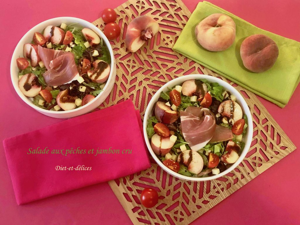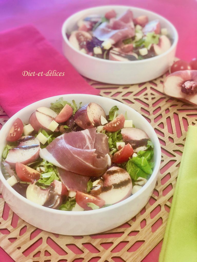 salade, jambon, pêche , sucré salé, jambon cru, pêche plate , amandes, plat complet