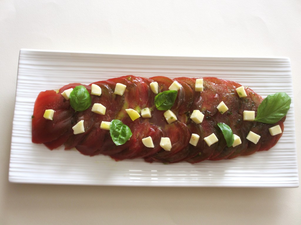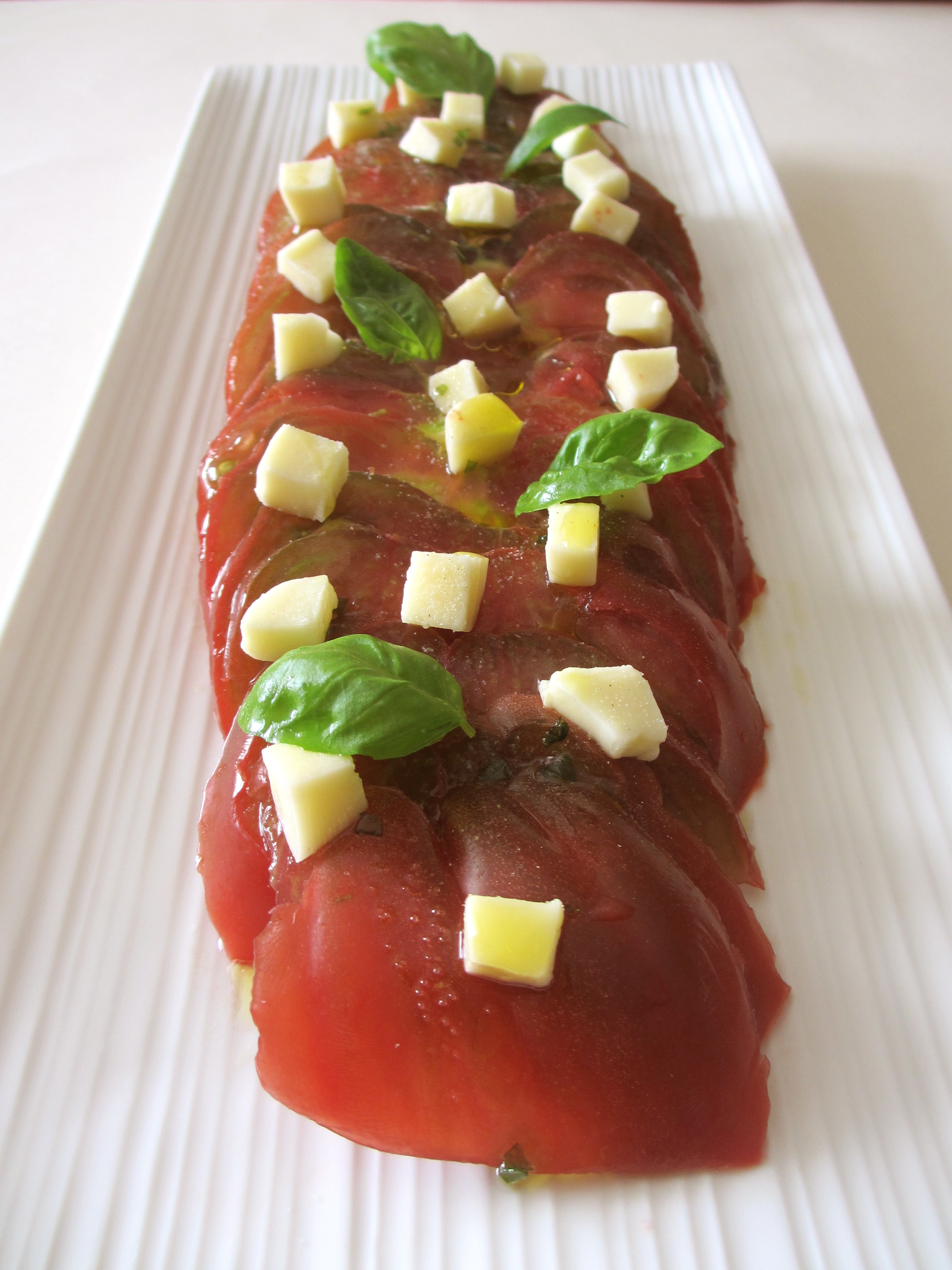 salade caprese, cuisine italienne, antiparti, salade tomates mozzarella, mozzarella, tomates, salade de tomates,basilic, salade froide, entrée, entrée estivale,entrée froide, tomate noire de crimée, salade de tomate noire de crimée