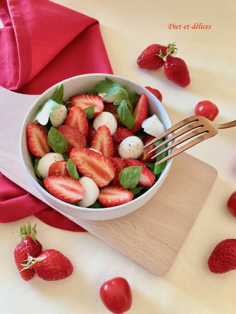 salade, sucré salé, tomates cerises, fraise, mozzarella, roquette