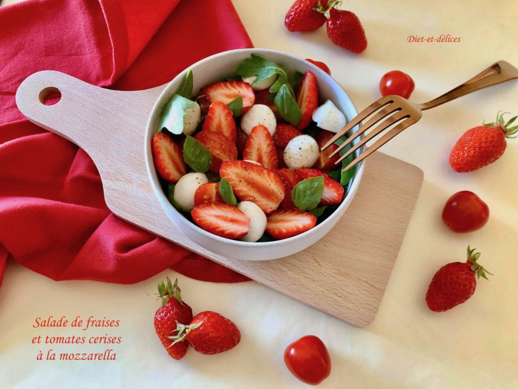 salade, sucré salé, tomates cerises, fraises, mozzarella, roquette
