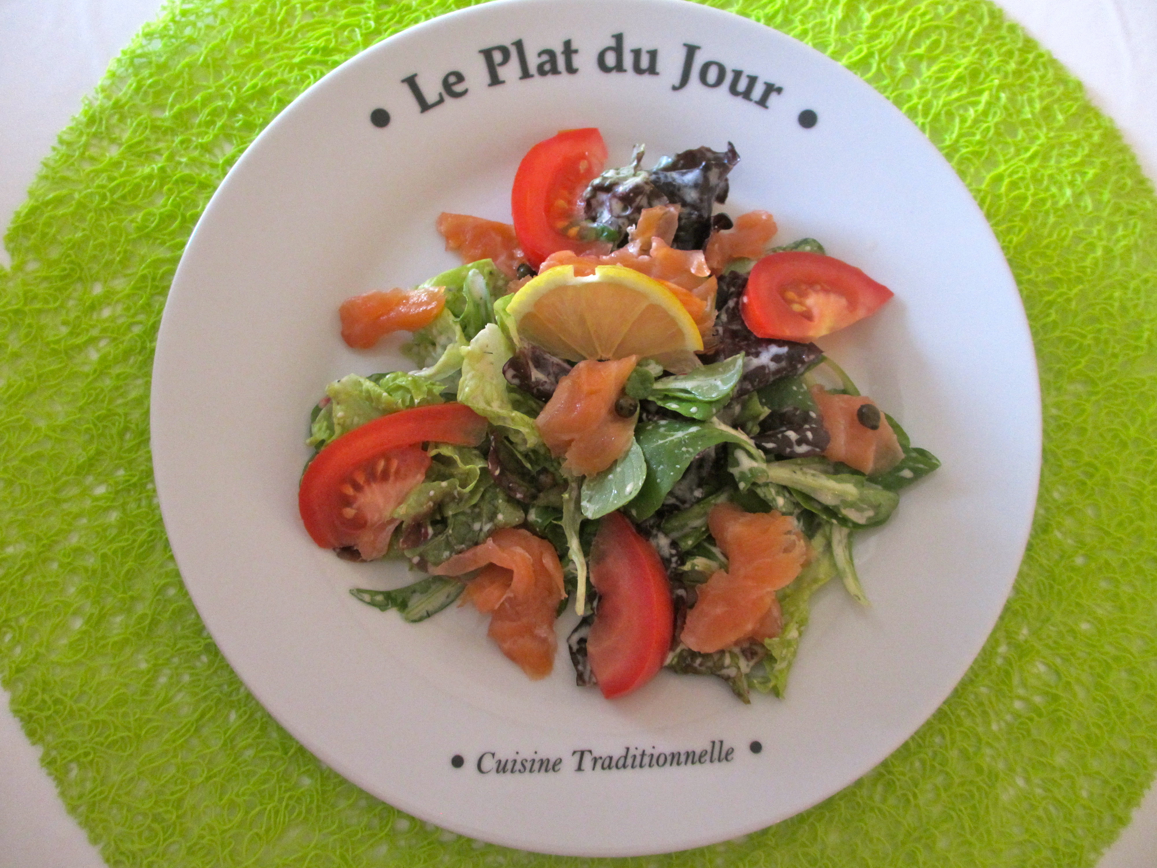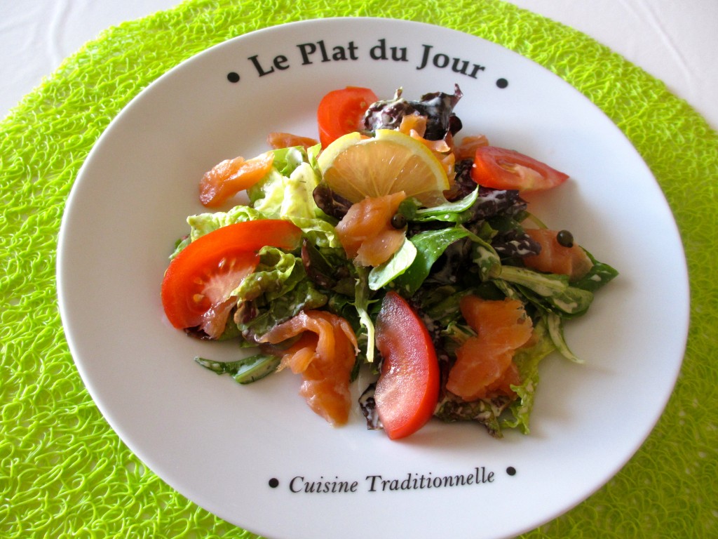 salade, jeunes pousses, vinaigrette, fromage blanc, vinaigre de mangue, aneth, saumon, saumon fumé, tomate, huile d’olive