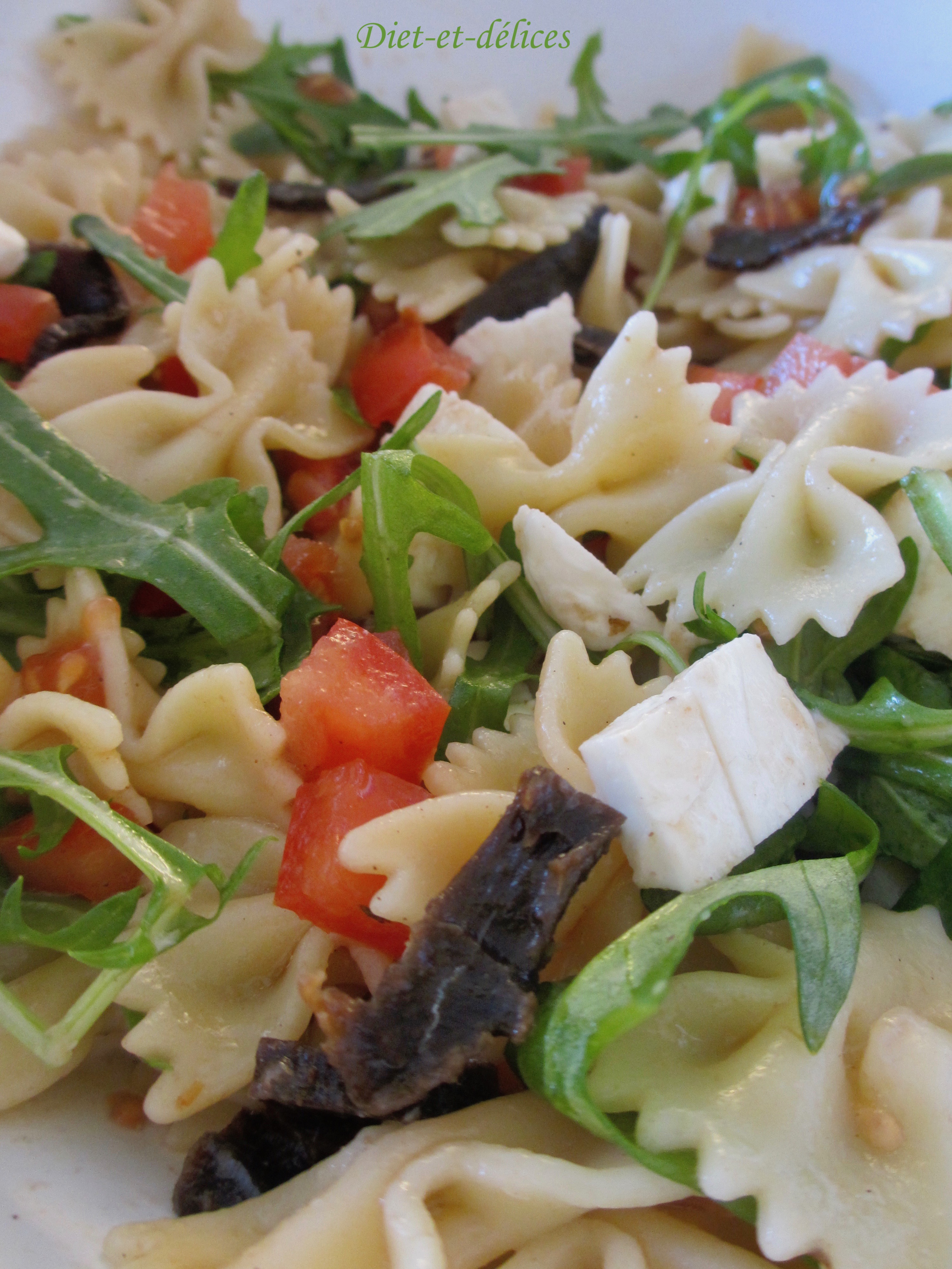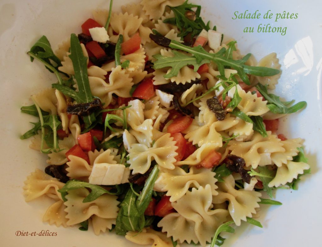 biltong, pâtes, salade de pâtes, viande séchée, roquette, tomate, mozzarella, plat complet