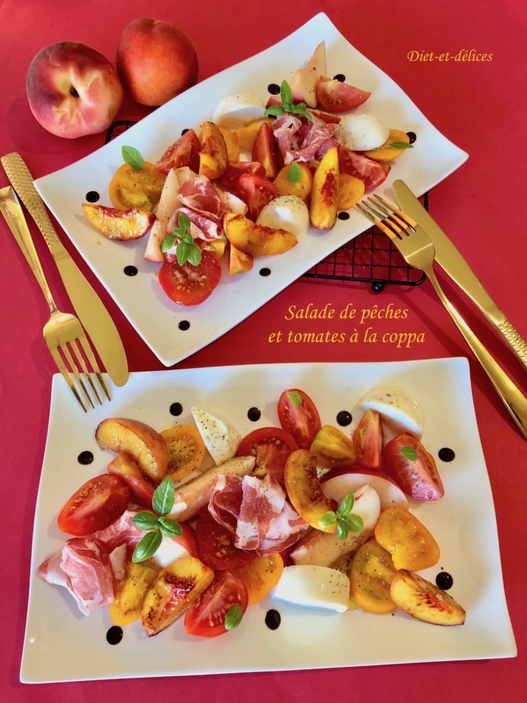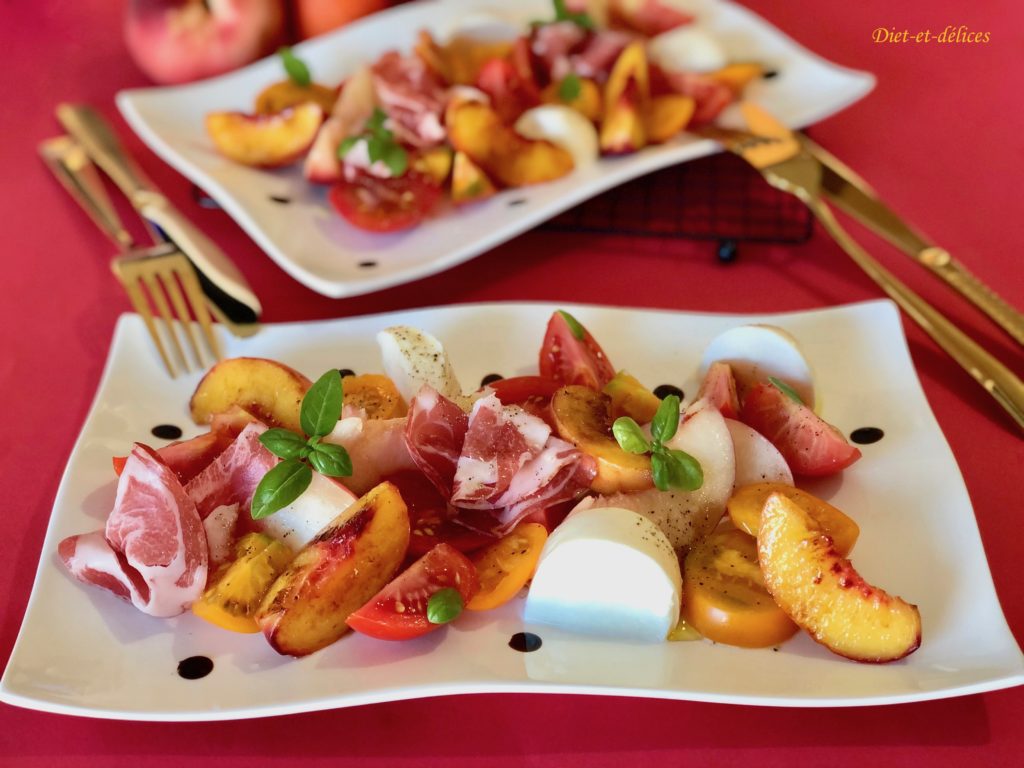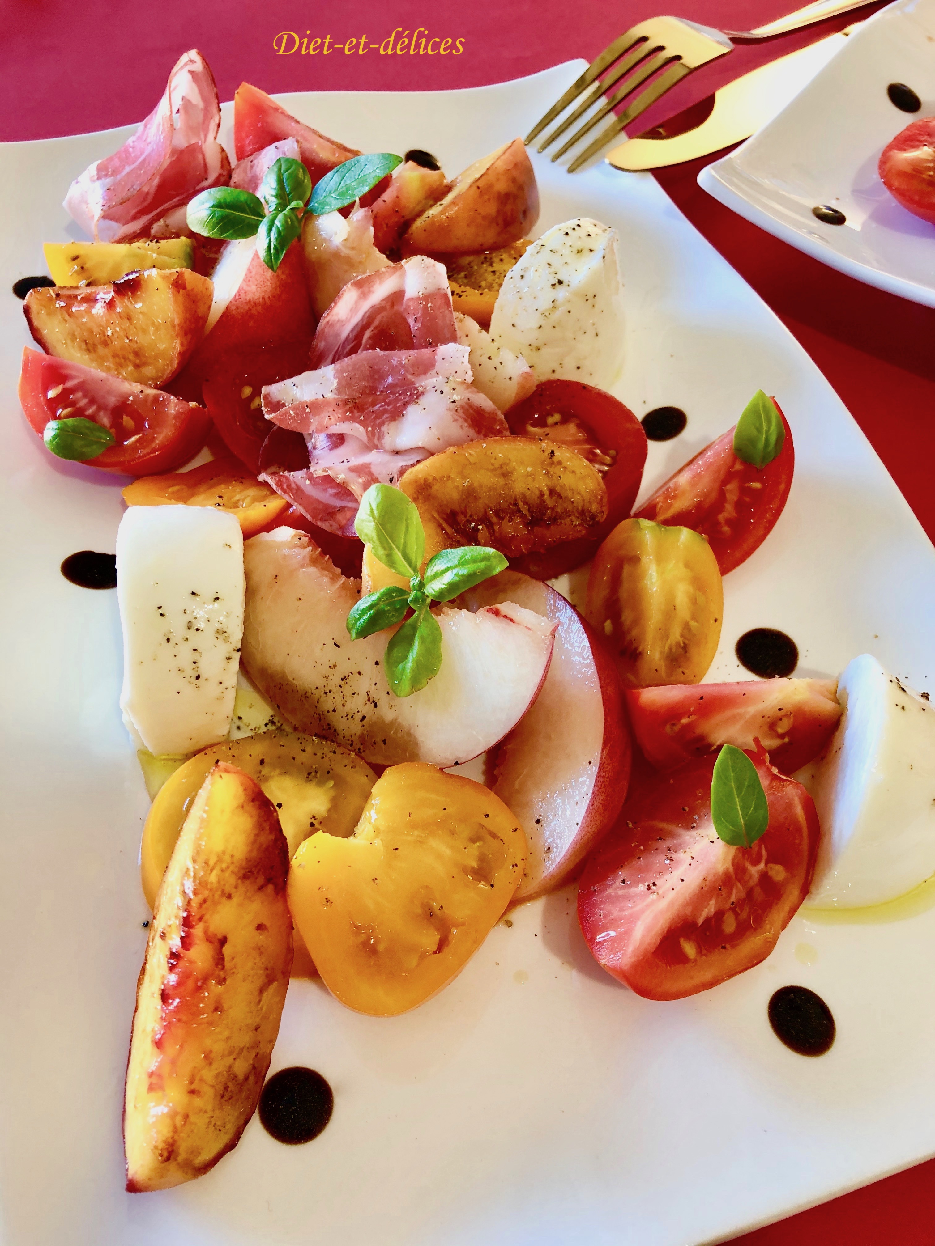 salade composée, sucré salé , pêches, coppa, mozzarella , tomates