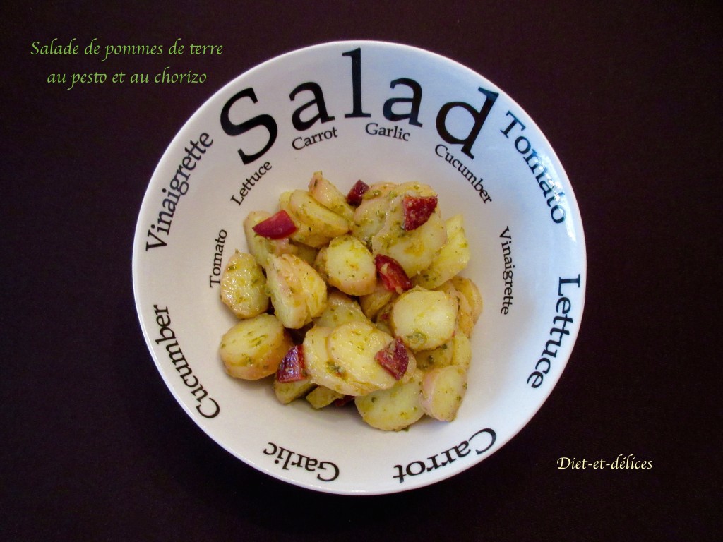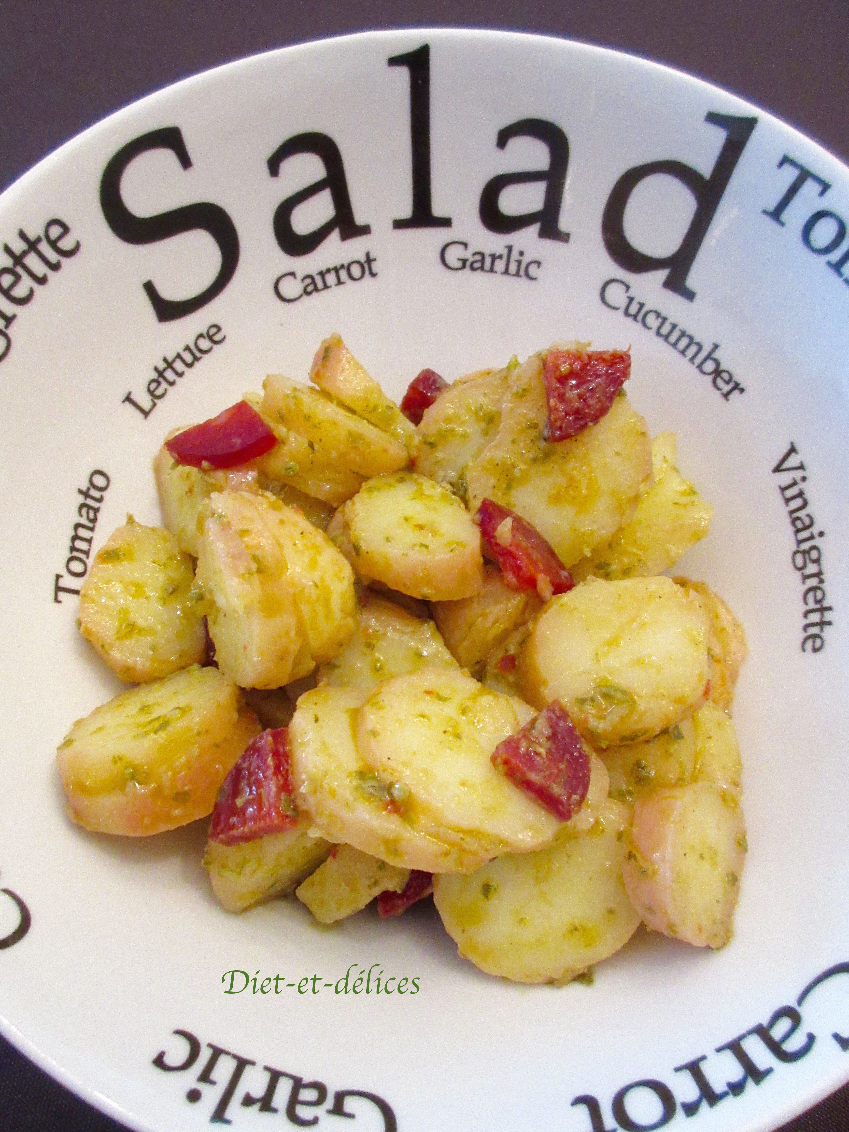pommes de terre, pesto, chorizo, salade de pommes de terre, salade, accompagnement, salade de pommes de terre au pesto, plat froide, vinaigrette au pesto