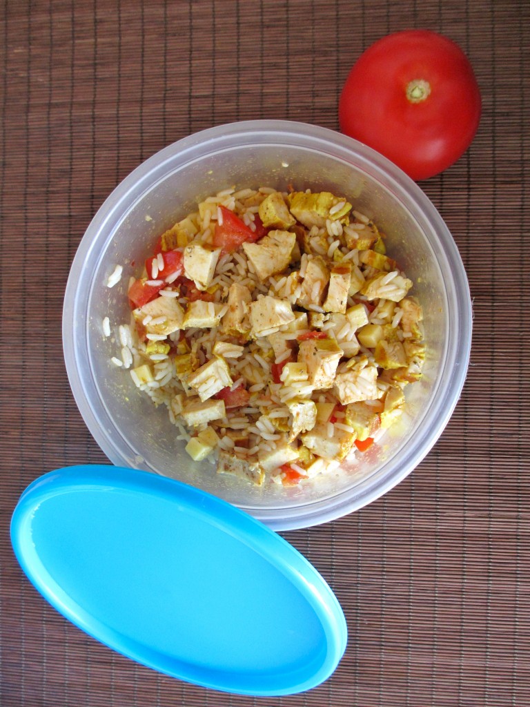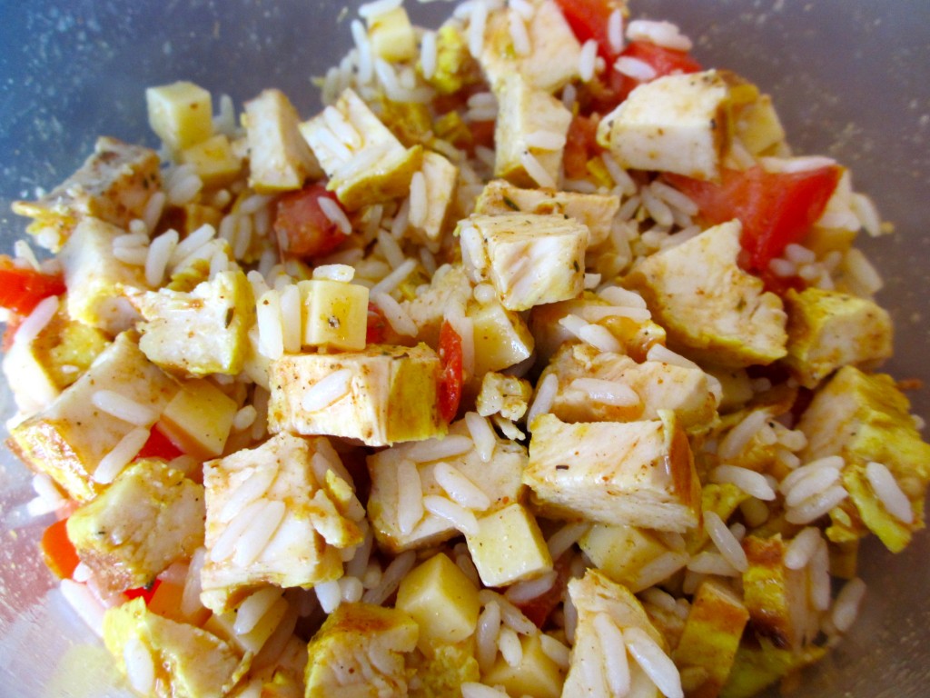 salade, salade de riz, salade de riz au poulet, poulet, poulet froid, accompagnement plat froid,riz, filet de poulet, blanc de poulet, cajun, tomate comté, barbecue, huile d’olive, vinaigre salade de riz, poulet, comté, tomates, vinaigrette