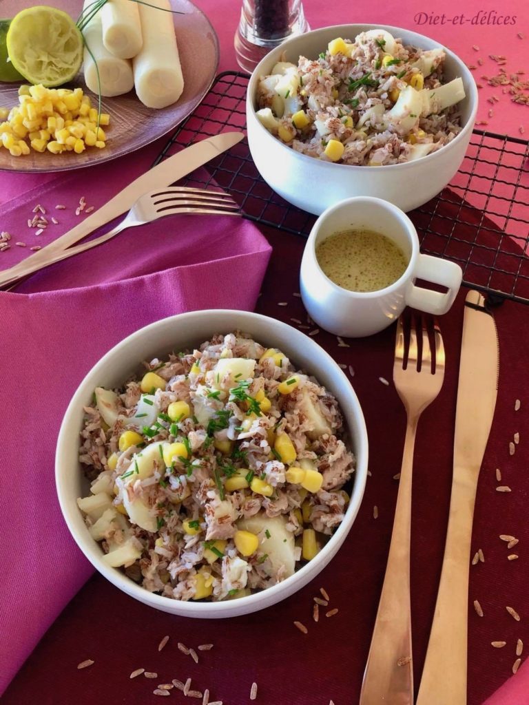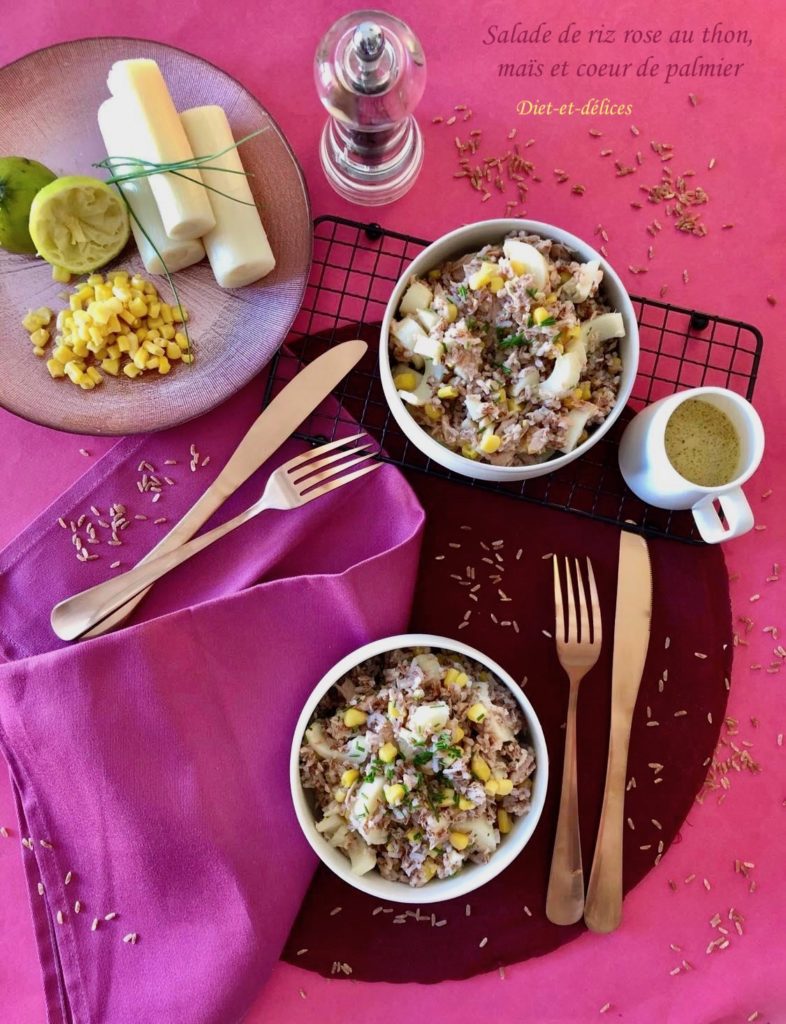 - Dans un saladier, mélanger le riz cuit, le thon émietté, le maïs, les coeurs de palmier.