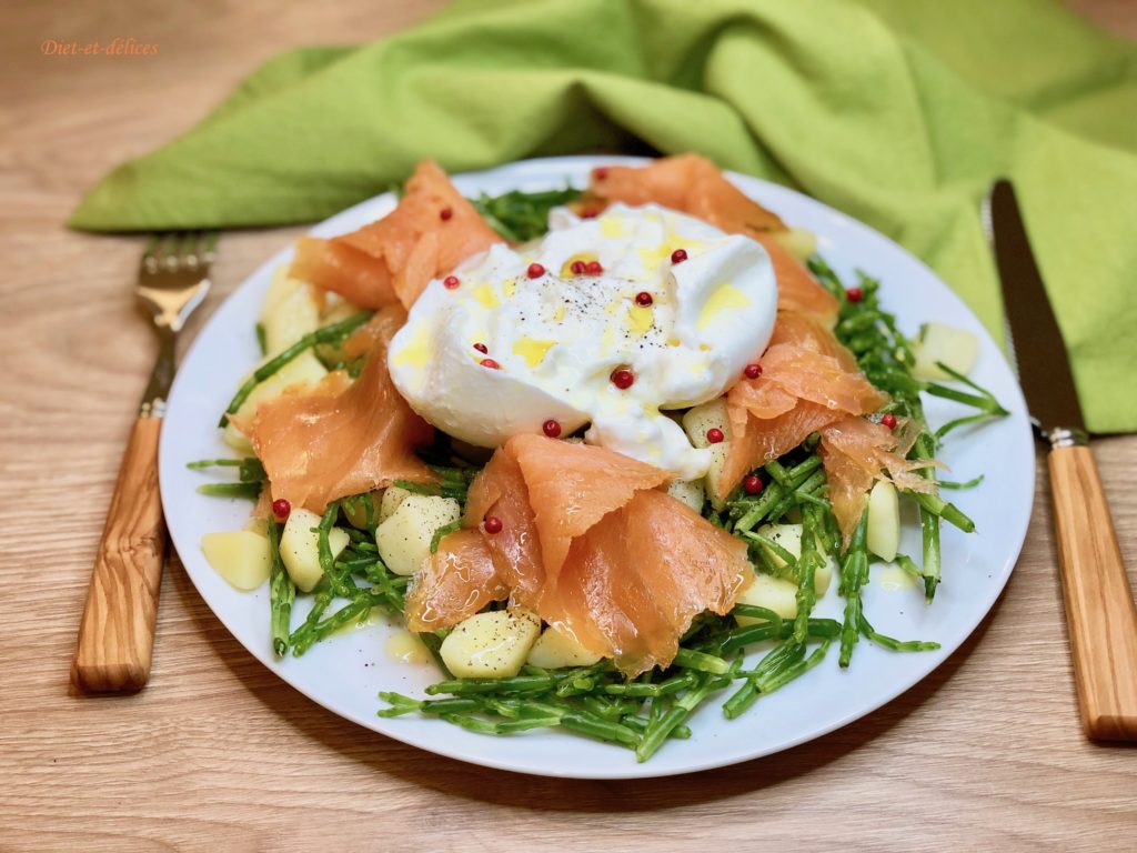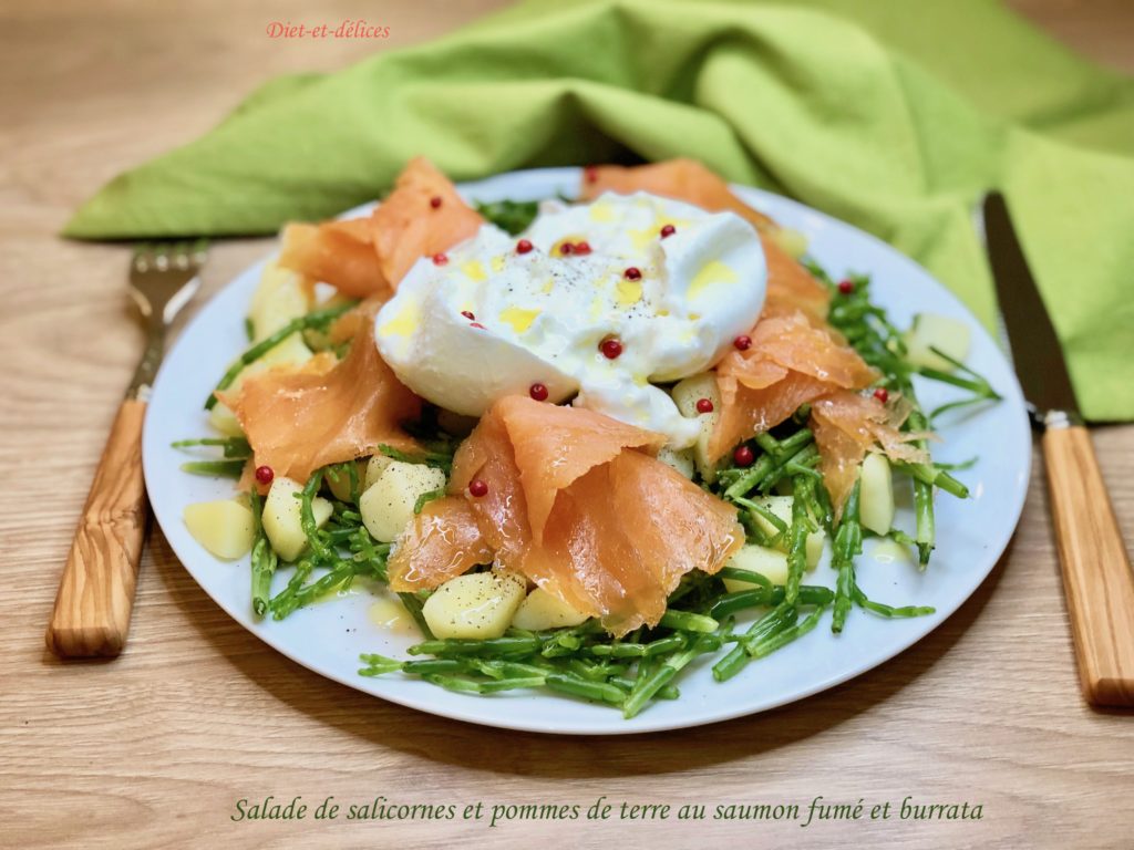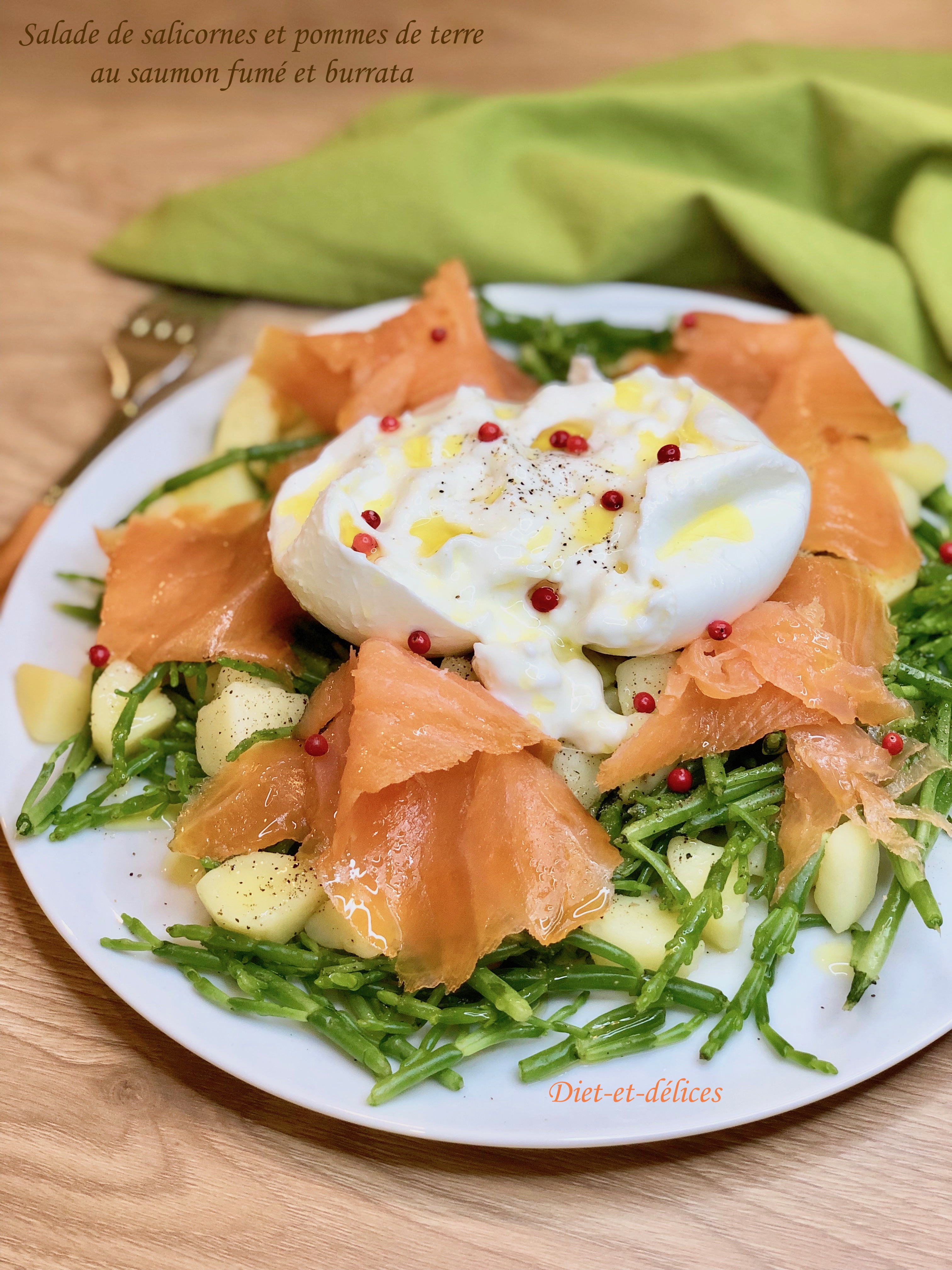salicornes, saumon, saumon fumé, salade composée, pommes de terre, burrata, plat complet, baies roses