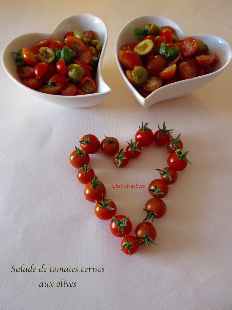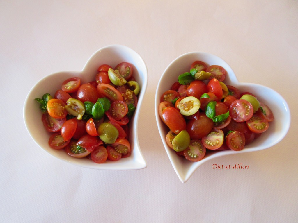 tomates cerises, salade, olives, salade de tomates cerises, salade de tomates, olives vertes, salade de tomates cerises aux olives, vinaigrette légère, rapide
