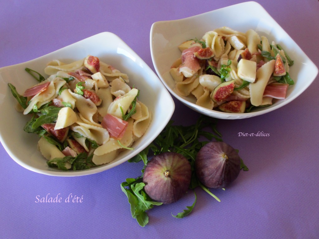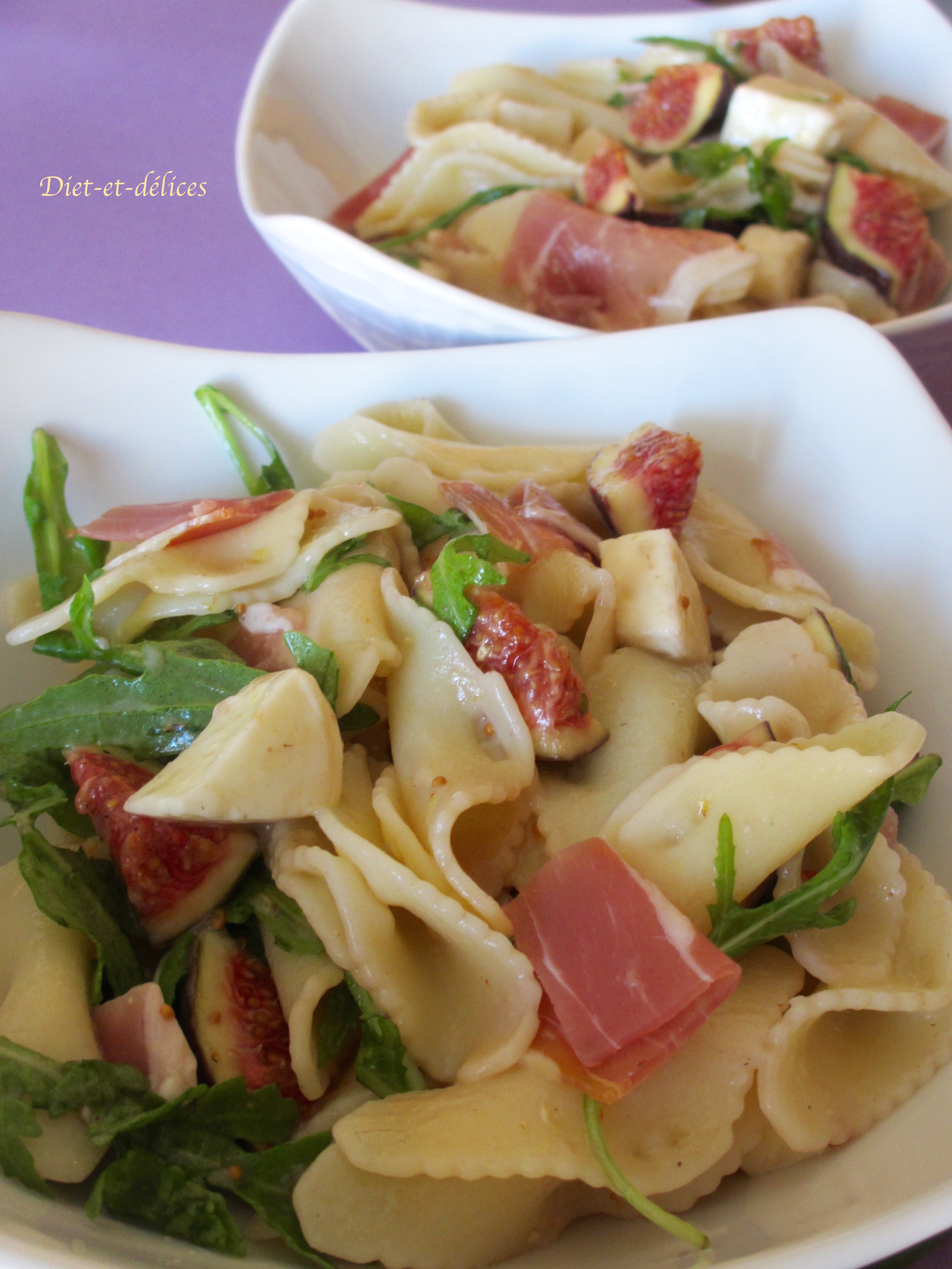 salade, salade de pâtes, figues, roquette, jambon, jambon cru, vinaigre de framboises, plat complet, salade estivale, été, simple, mozzarella
