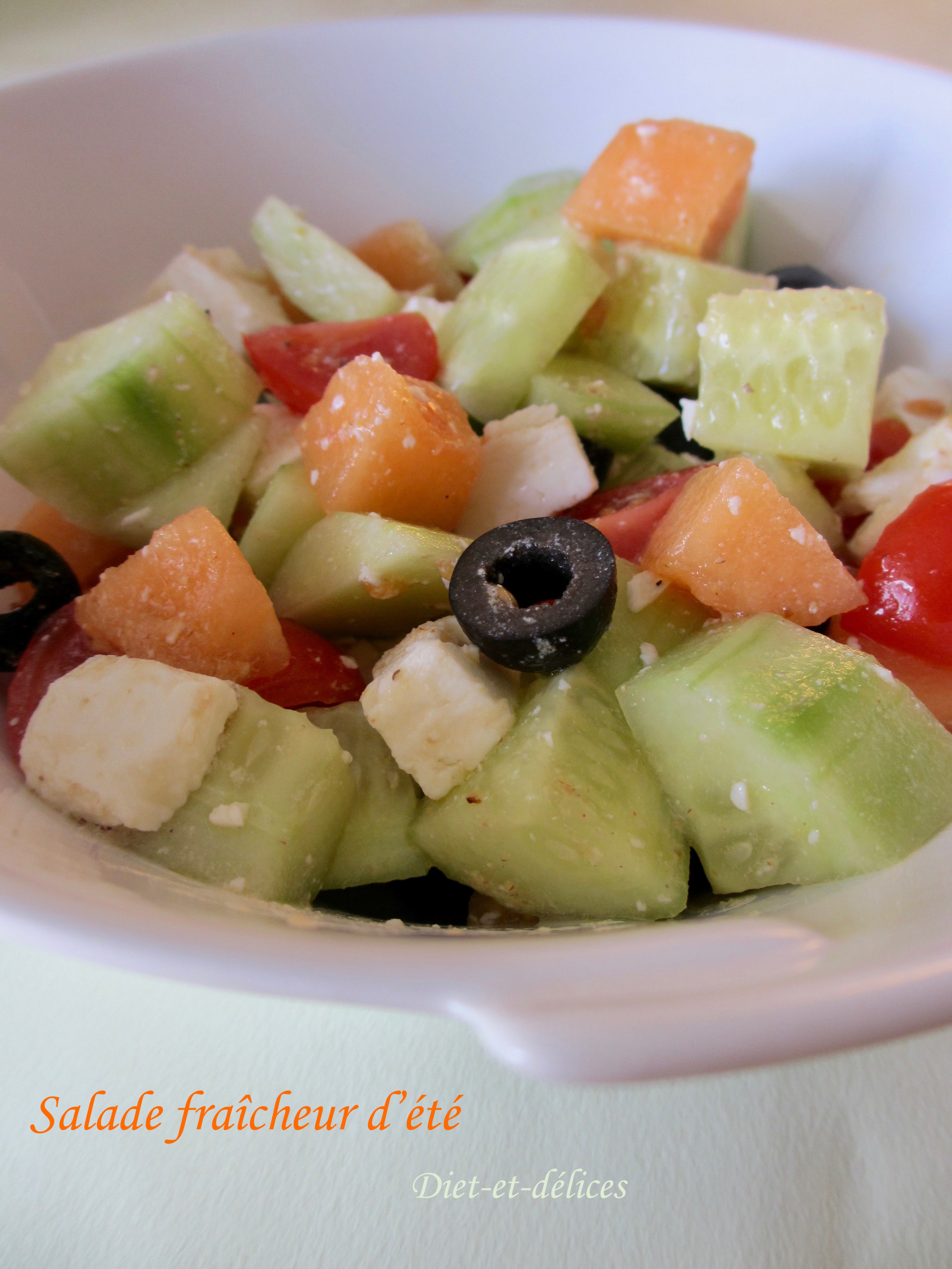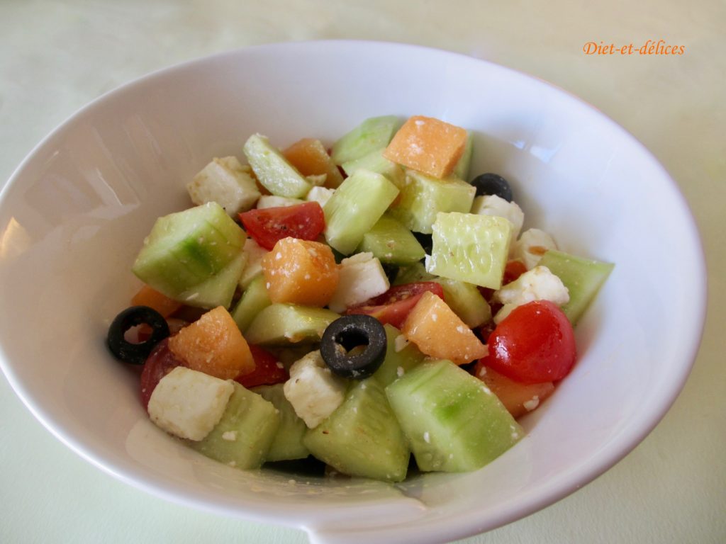 salade, feta, concombre, salade fraîcheur, olives, tomates cerises, melon, végétarien