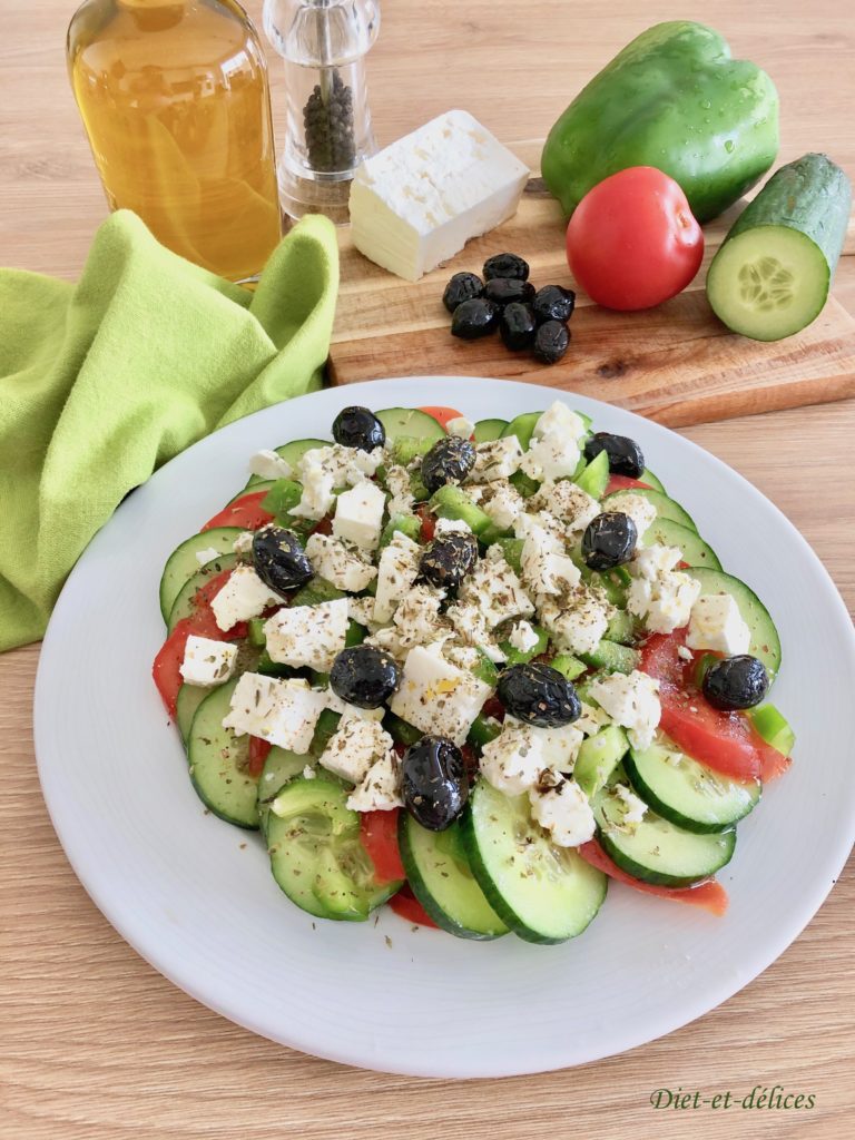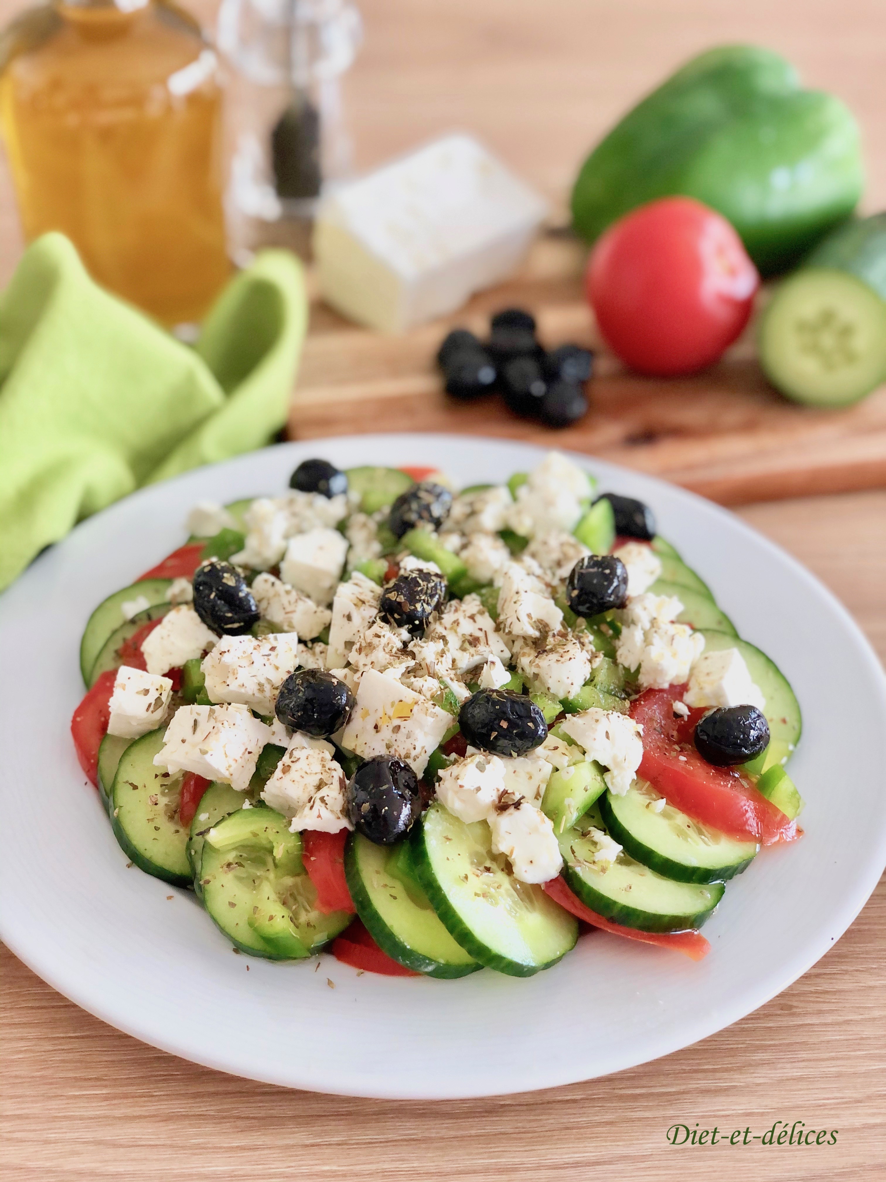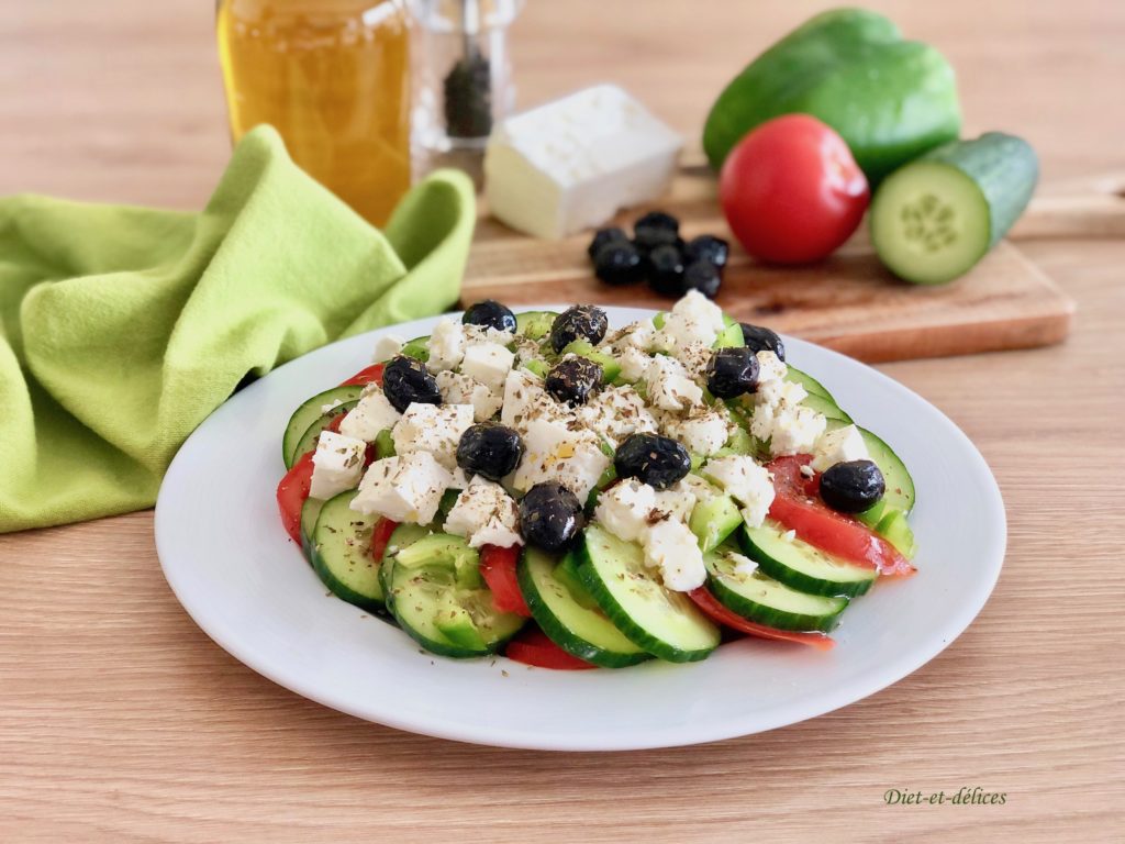 salade grecque, concombre, tomates, olives noires, feta, origan