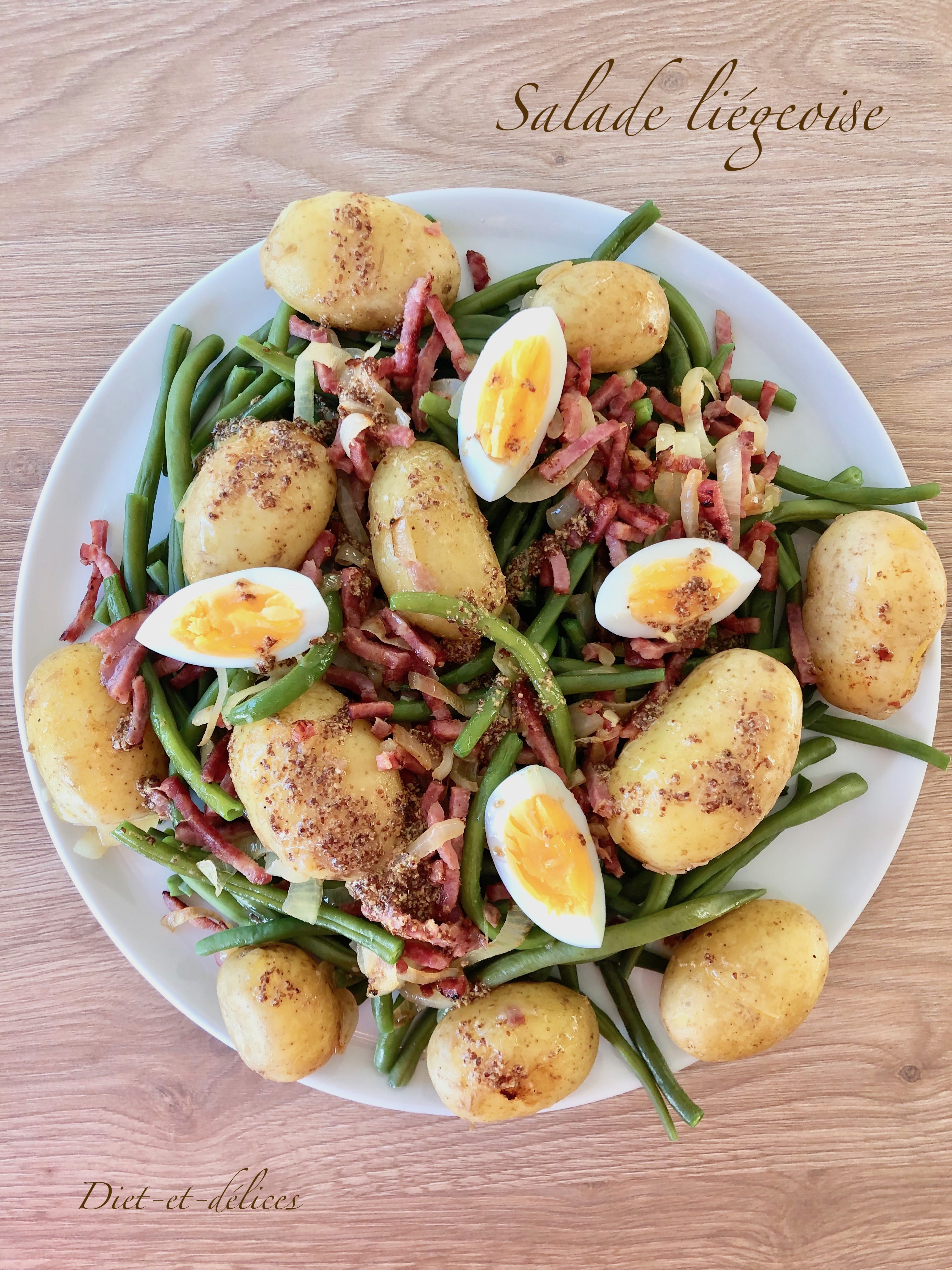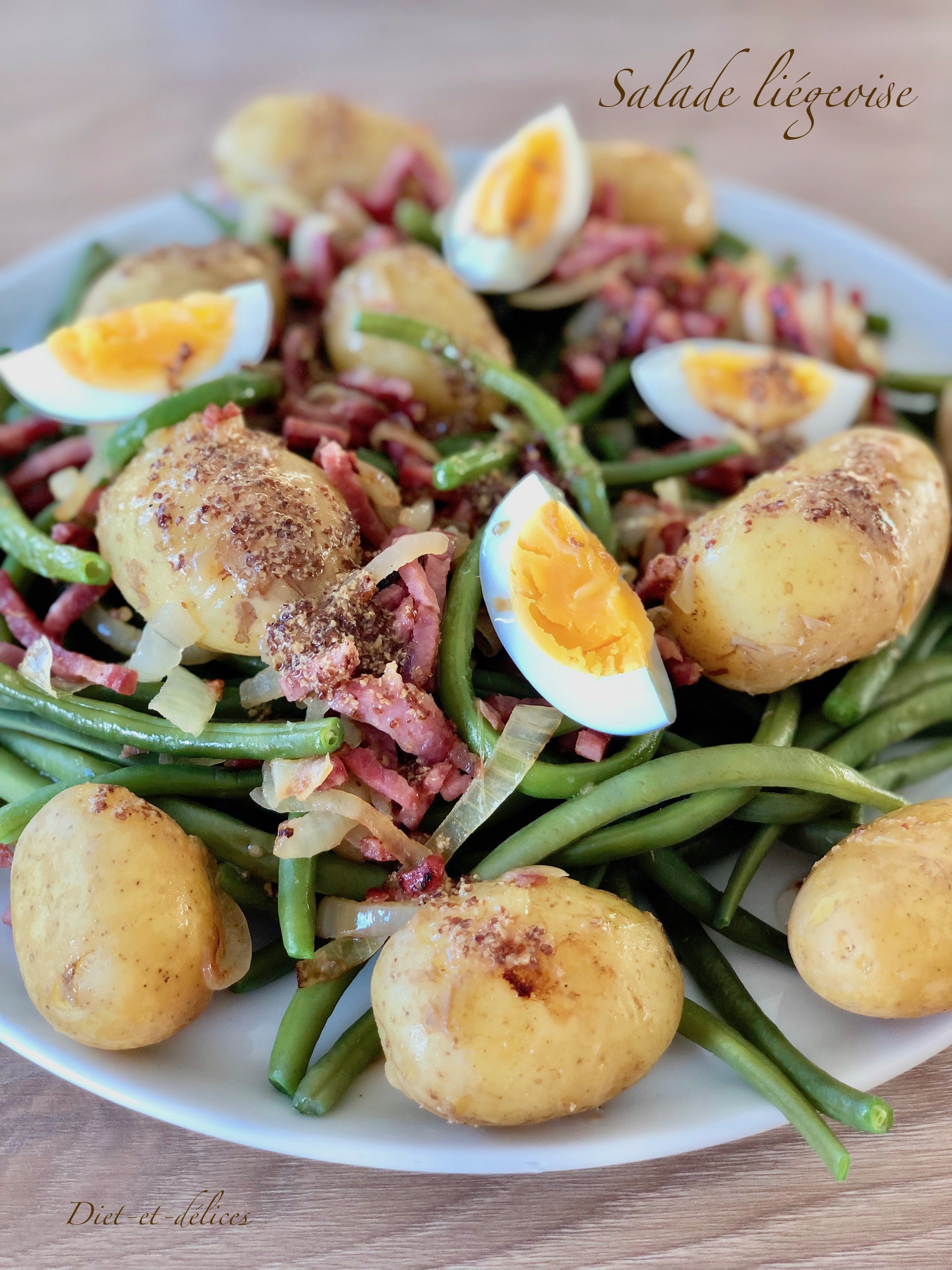 – La salade liégeoise appelée aussi potée liégeoise se compose de haricots verts, de pommes de terre, de lardons croquants et d’oignon. Des œufs cuits durs sont parfois ajoutés. Elle se déguste tiède accompagnée d’une vinaigrette à base de moutarde. Cette spécialité belge se sert aussi bien en entrée qu’en plat principal.