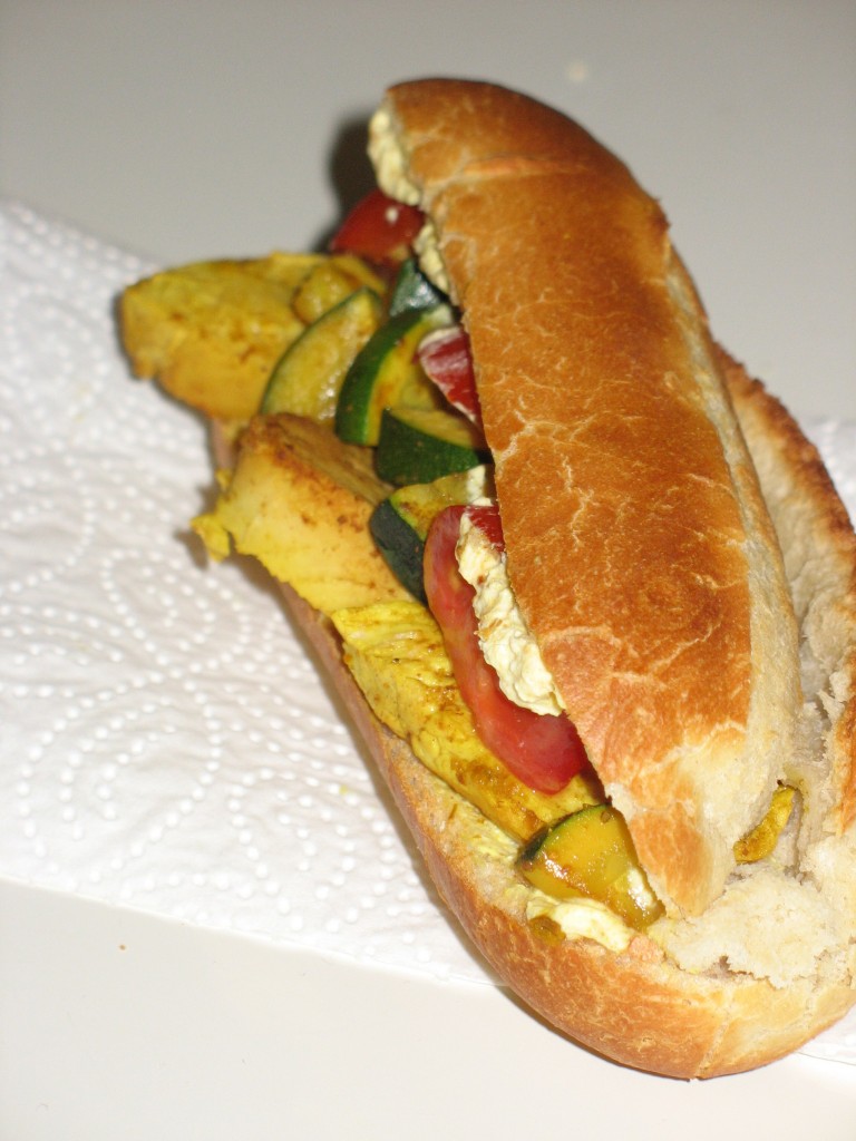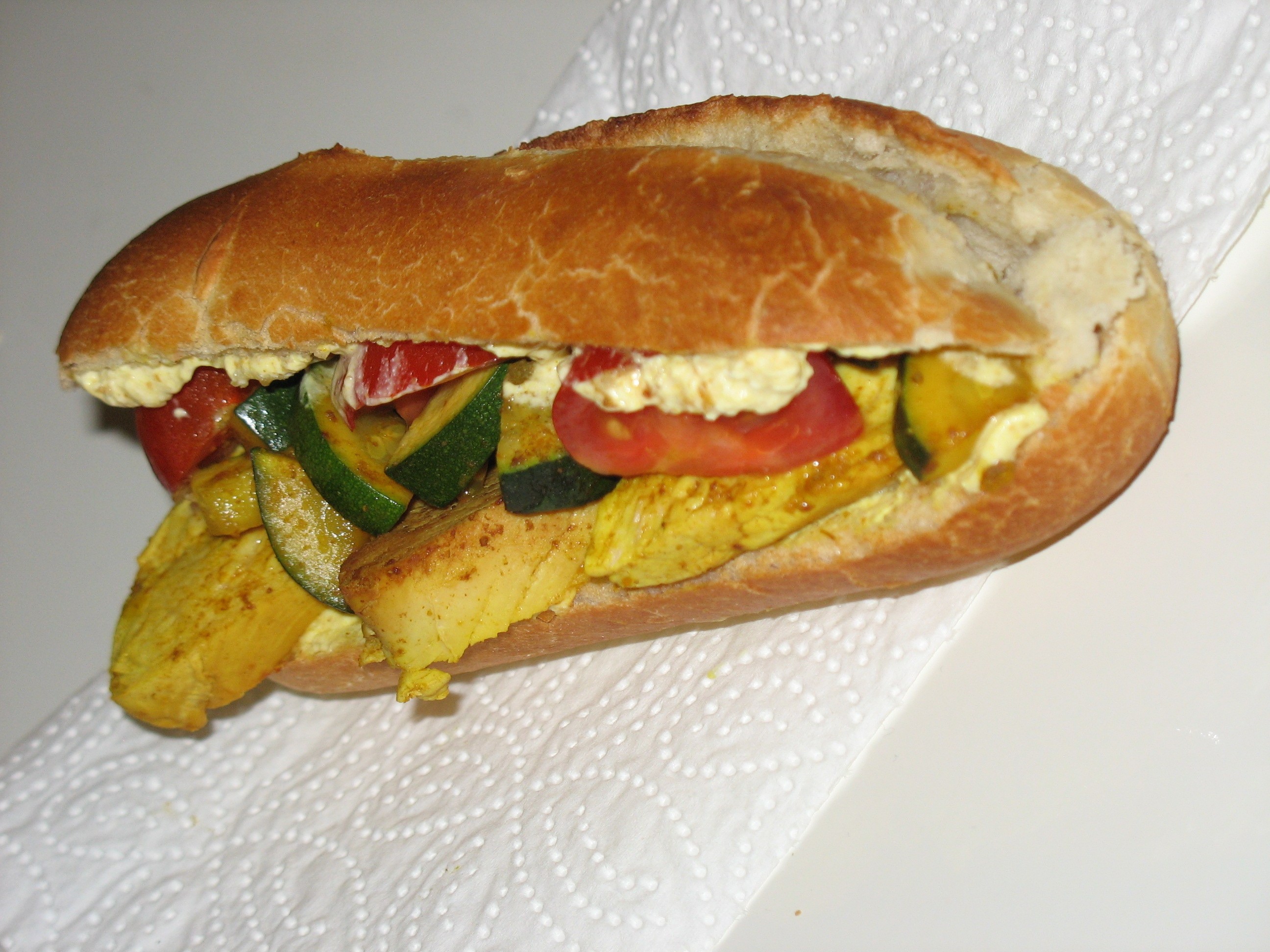 - Couper les petits pains en deux. Sur les deux faces internes étaler le mélange à base de fromage. Disposer les tranches de poulet, les dés de courgettes. Ajouter quelques quartiers de tomates.