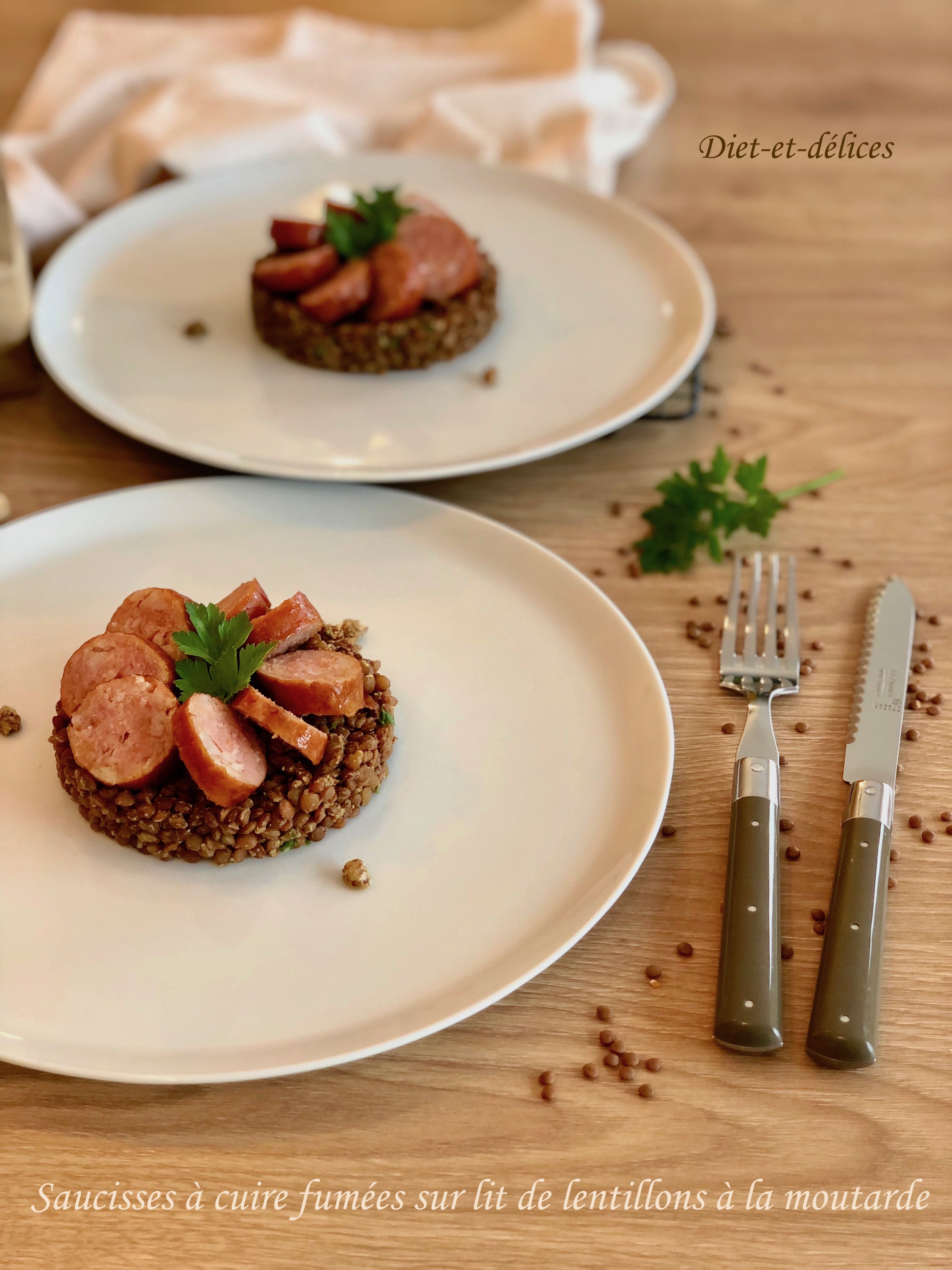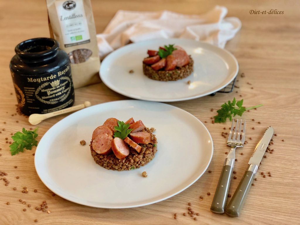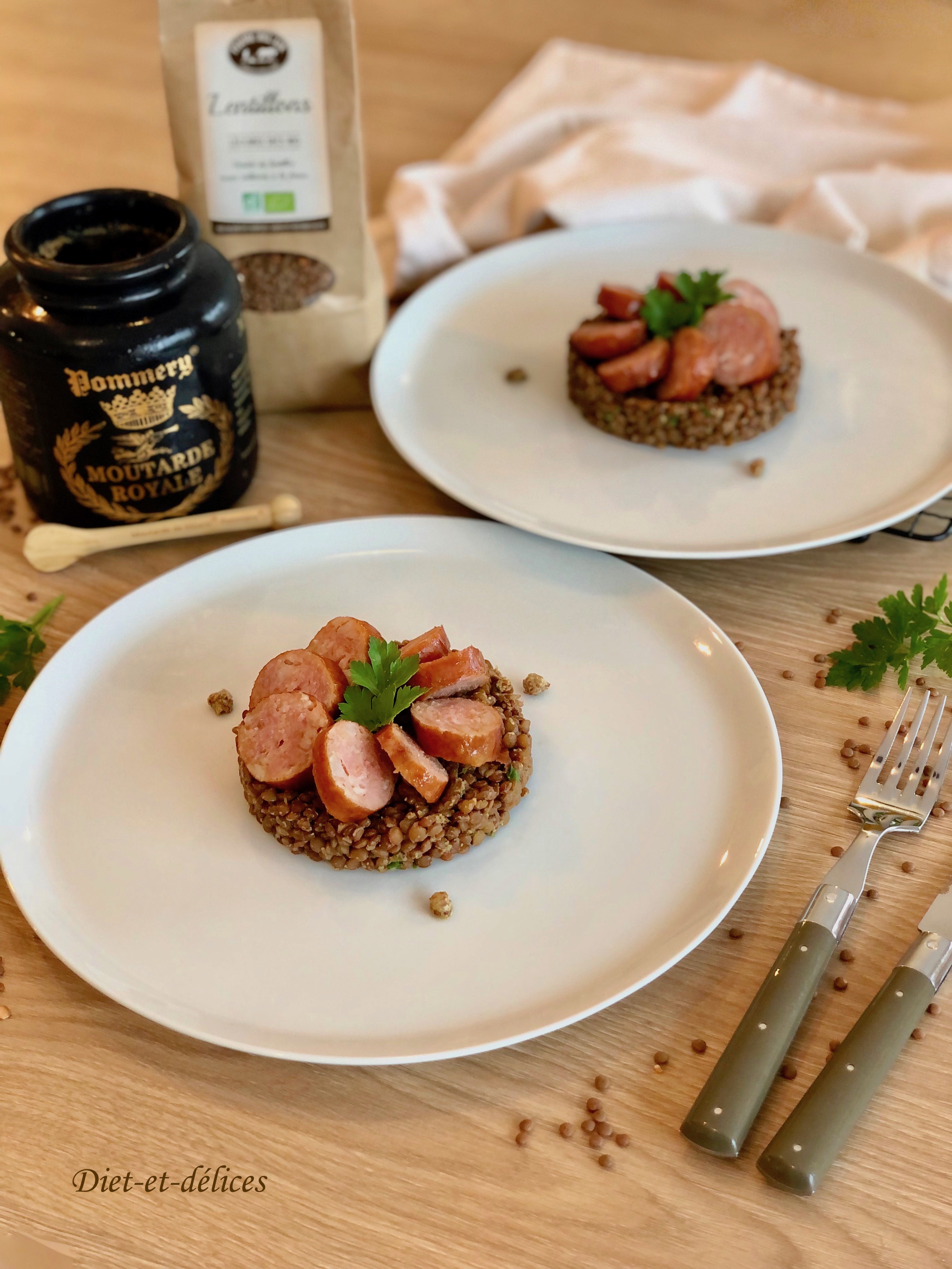 lentillons, saucisses à cuire, saucisses fumées, moutarde de meaux, plat complet, légumineuses, légumes secs