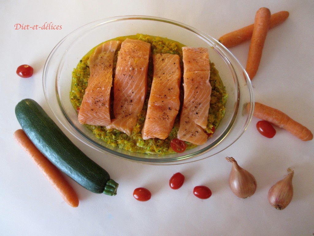 http://recettes.de/defi-poissons, saumon, poisson, carottes, saumon au four, poisson au four, courgettes, saumon au four sur lit de légumes, poisson au four sur lit de légumes, tomates cerises, cuisine diététique, cuisine saine, diététique