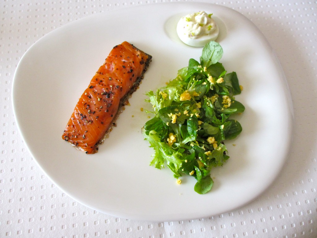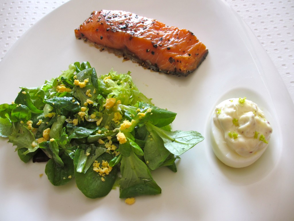 saumon, saumon au poivre, mayonnaise, citron, salade, oeuf, mayonnaise au citron,oeuf dur, citron vert, mâche, vinaigrette, poisson
