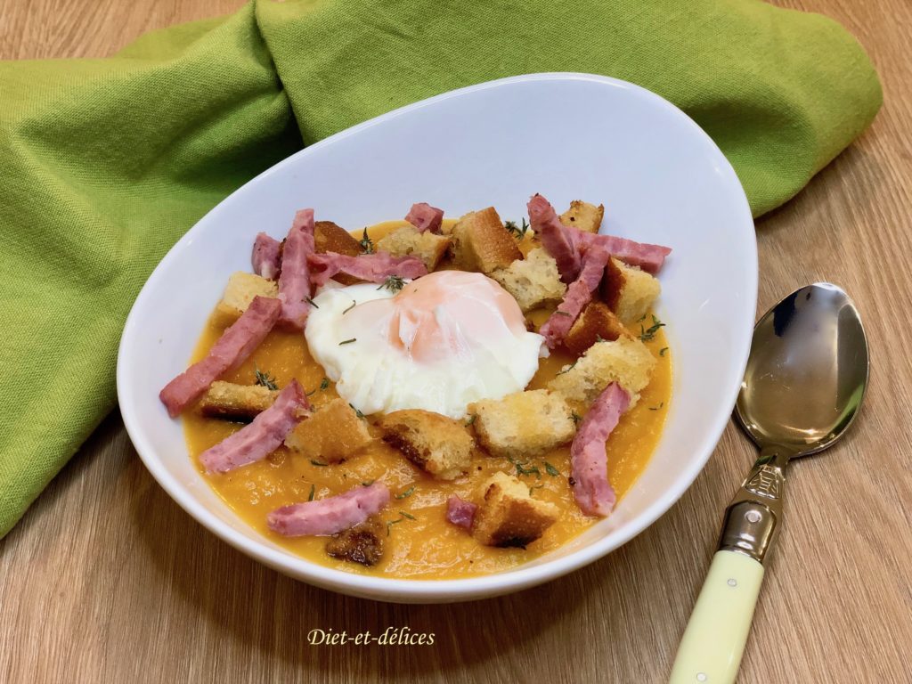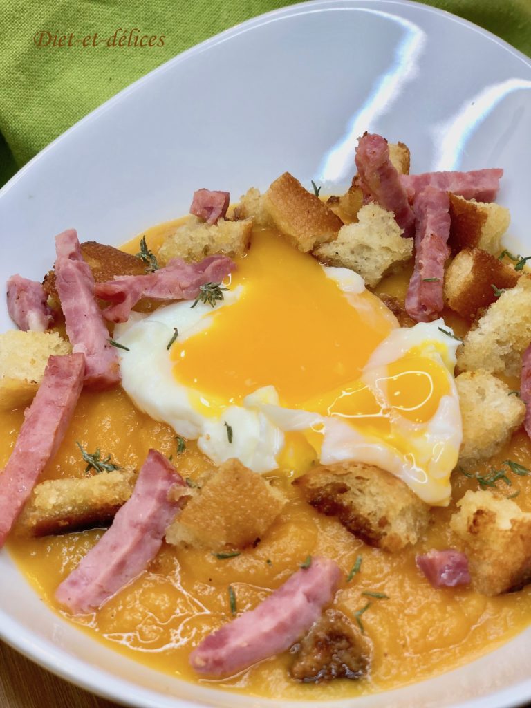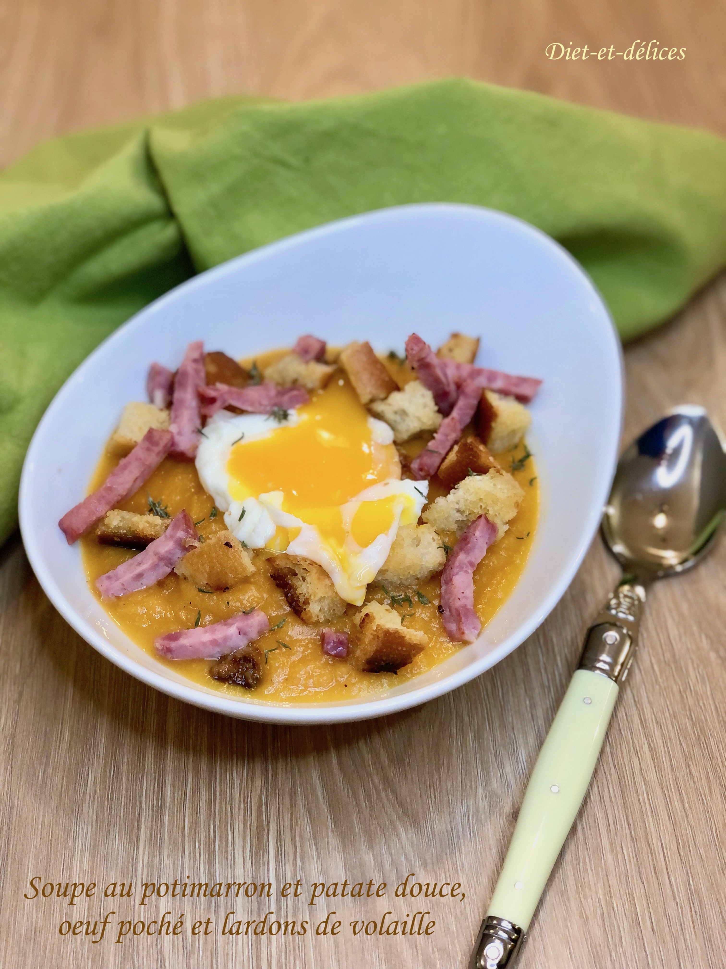 soupe, potimarron, patate douce, soupe au potimarron, oeuf, oeuf poché, lardons de volaille, croûtons