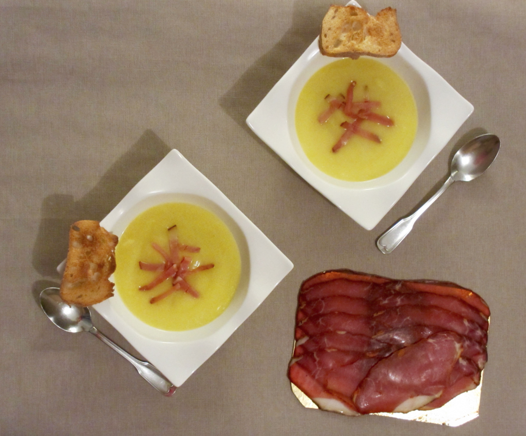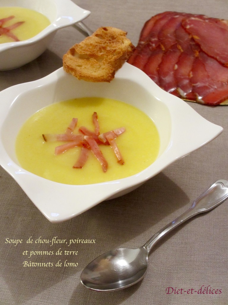 soupe, chou-fleur, pommes de terre, soupe de chou-fleur, chou-fleur et pommes de terre, poireau, soupe de chou-fleur et pommes de terre, blanc de poireau, curcuma, vegan, végétarien, végétalien, diététique, cuisine diététique, saine, lomo, charcuterie, soupe au lomo