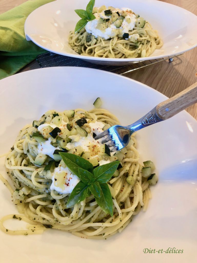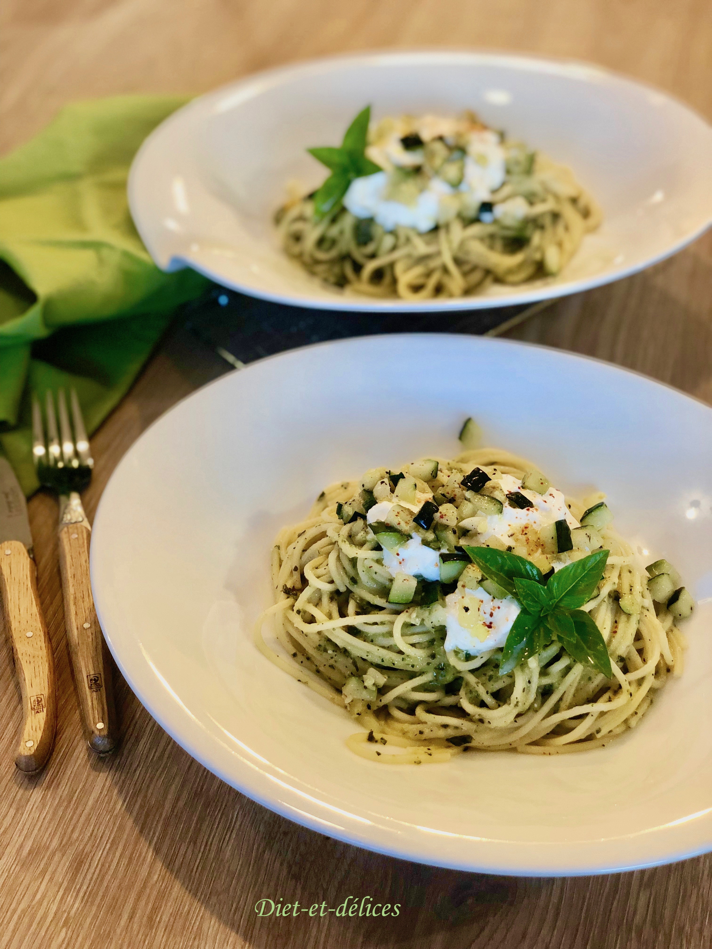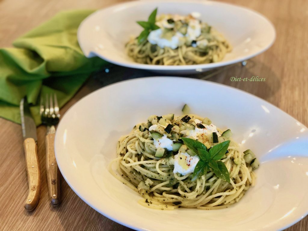 pâtes, courgette, spaghetti, pâtes à la courgette, burrata, crème de courgette, basilic, plat complet, sauce à la courgette