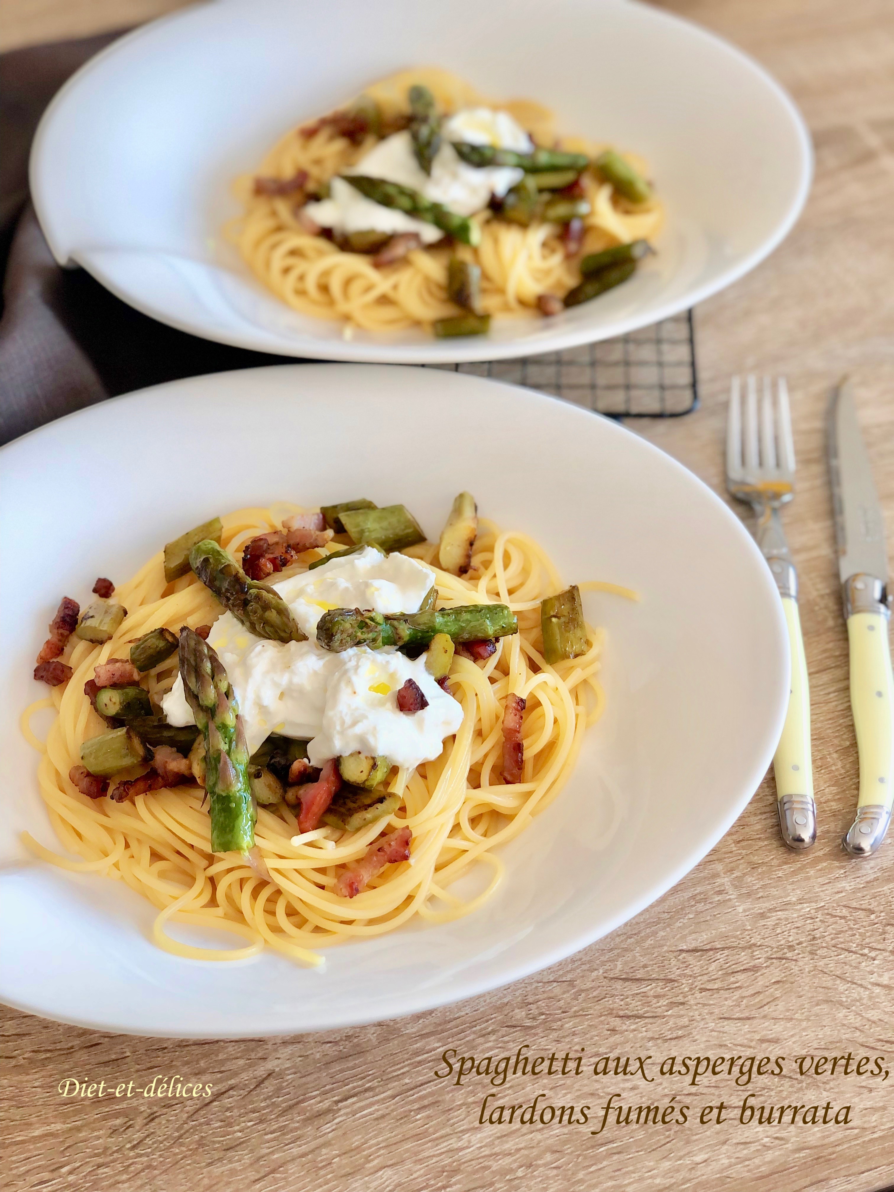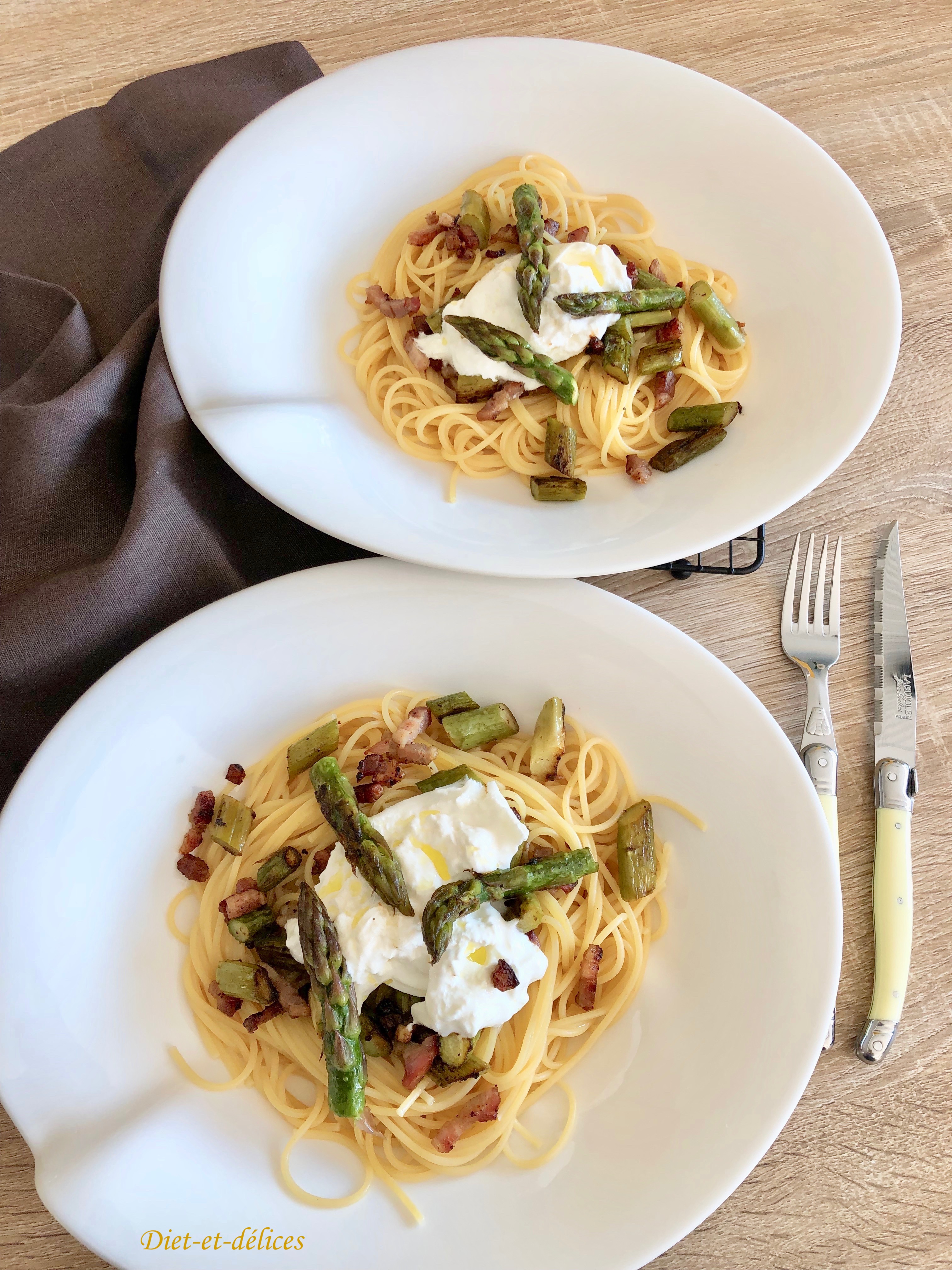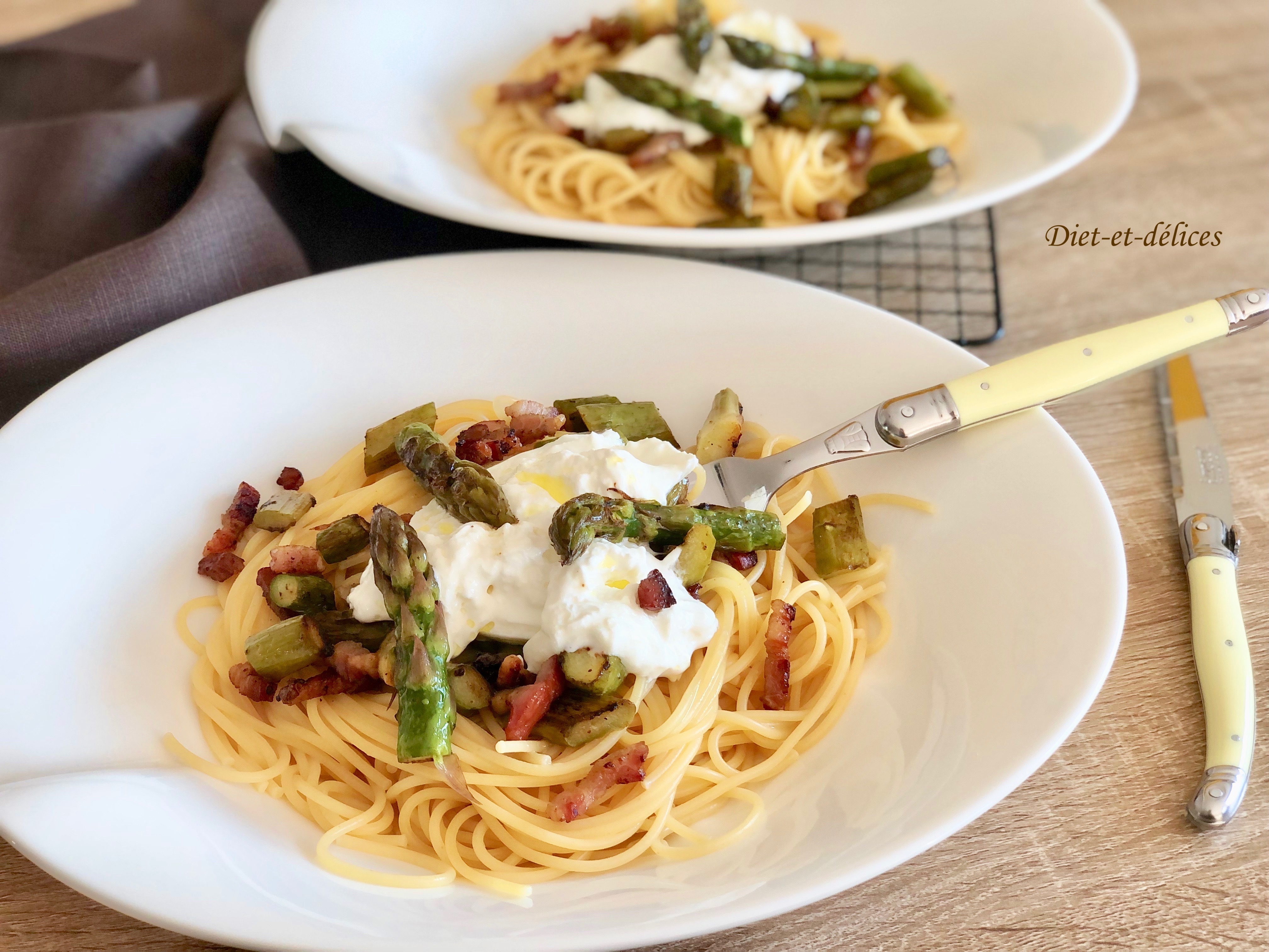 pâtes, spaghetti, asperges, pâtes aux asperges, lardons, asperges vertes, burrata, plat complet