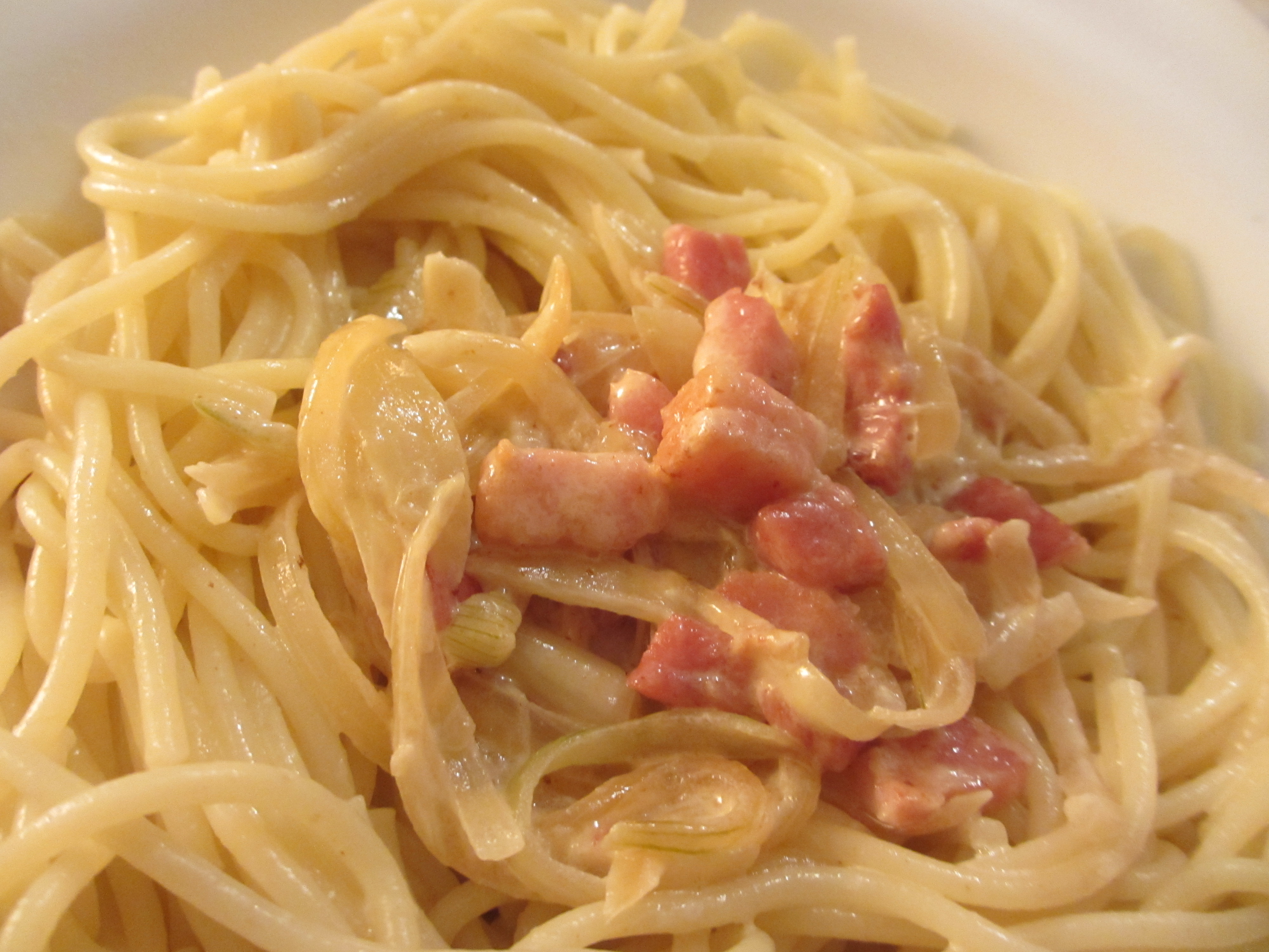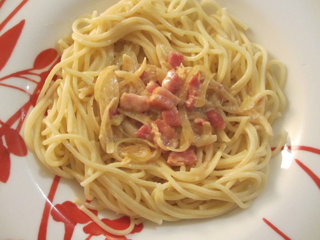 spaghetti, pâtes, pasta, pâtes à la carbonara, sauce , sauce carbonara, carbonara, lardons, crème, tomme,tomme de savoie, savoie