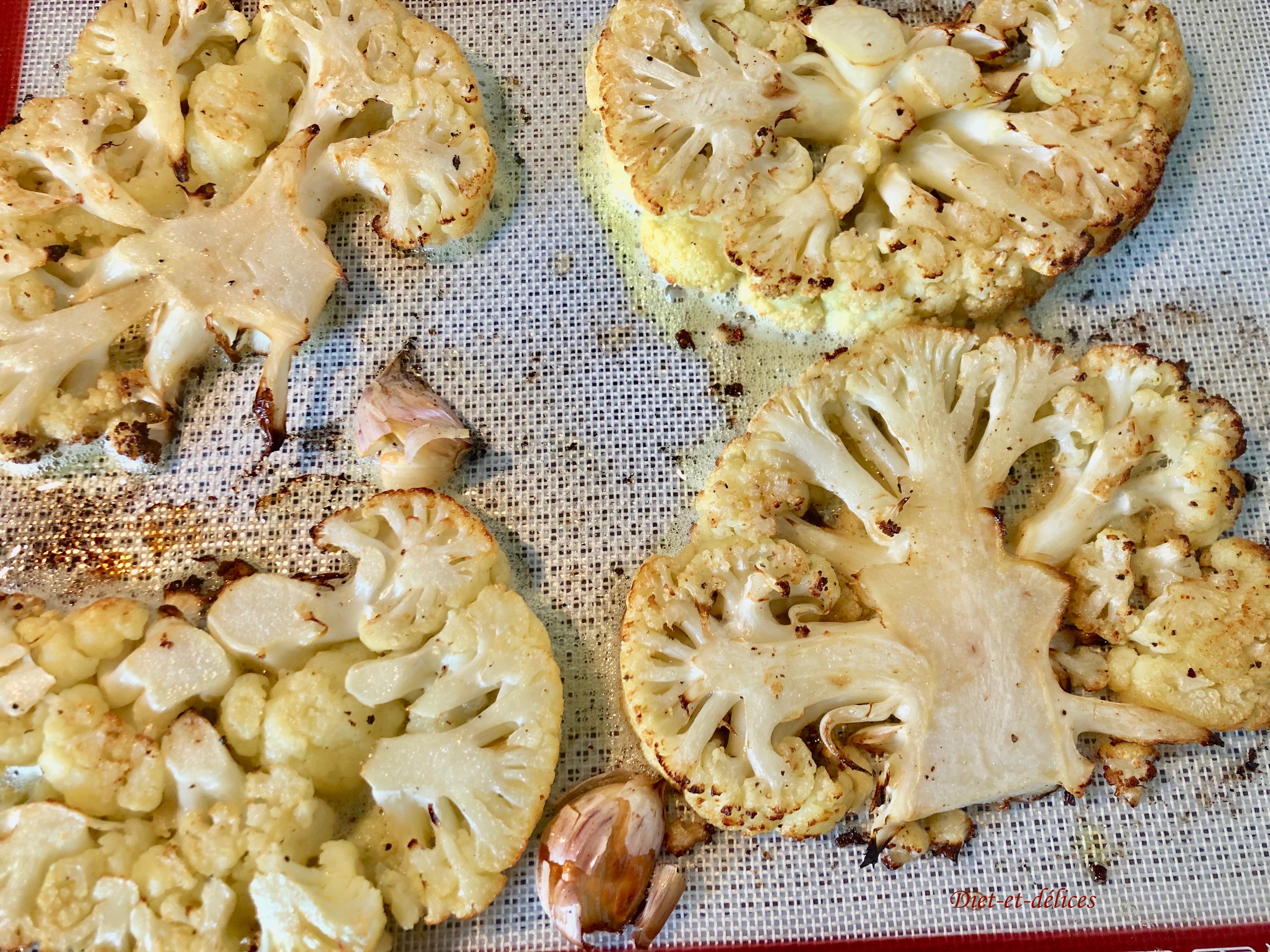 - Disposer les tranches de chou-fleur sur une plaque recouverte d’un papier cuisson.