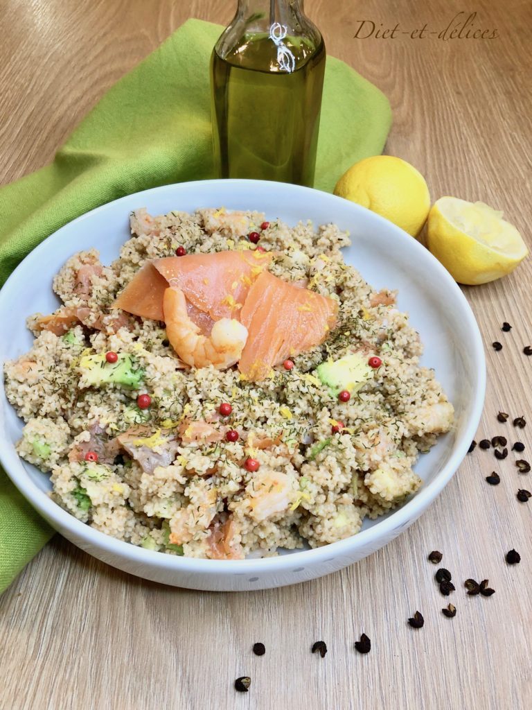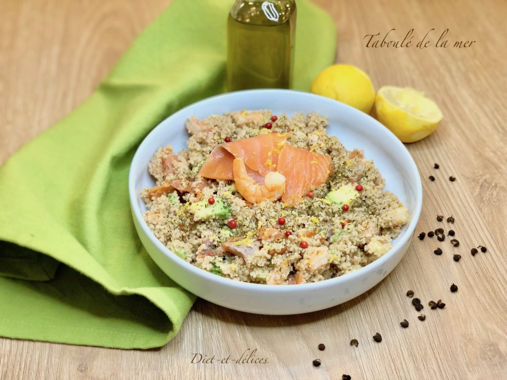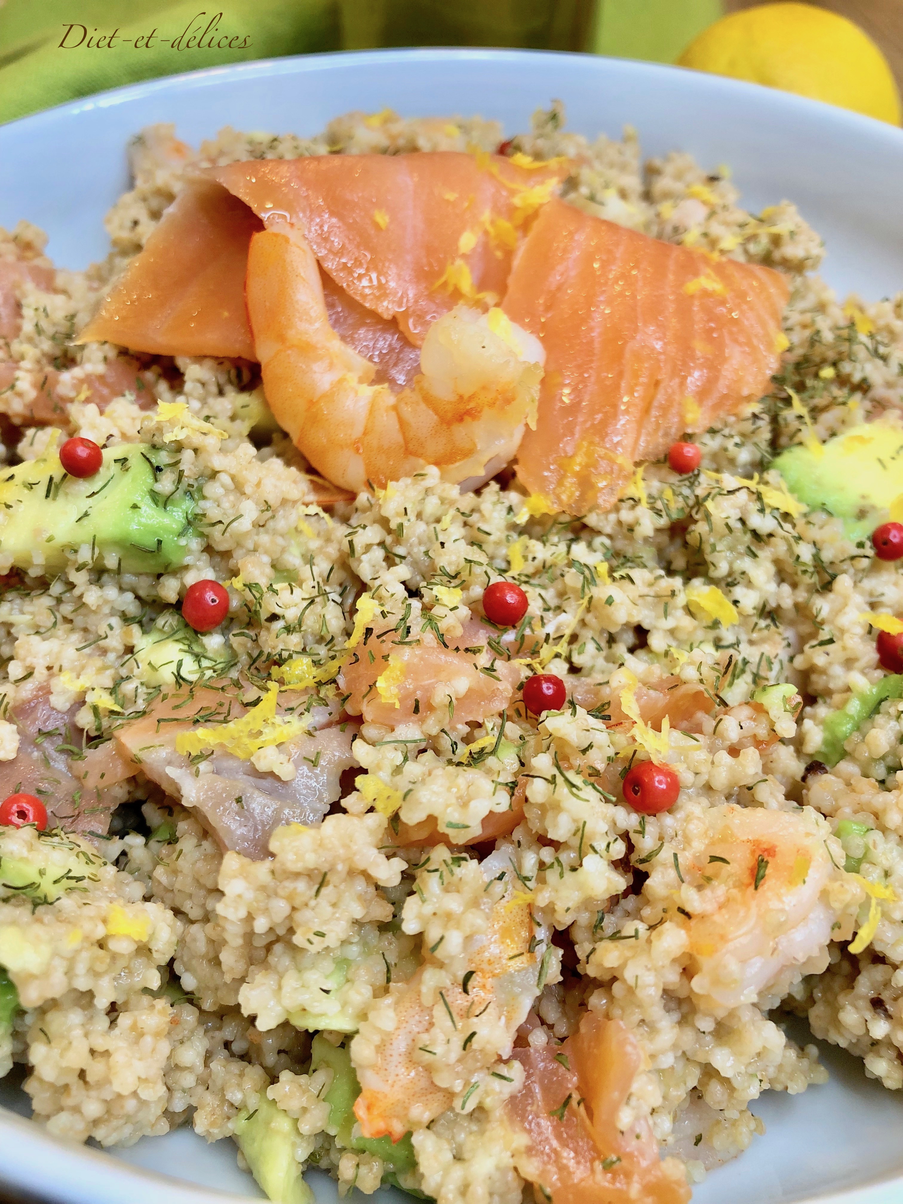 taboulé, taboulé de la mer, saumon fumé, crevettes, avocat, semoule