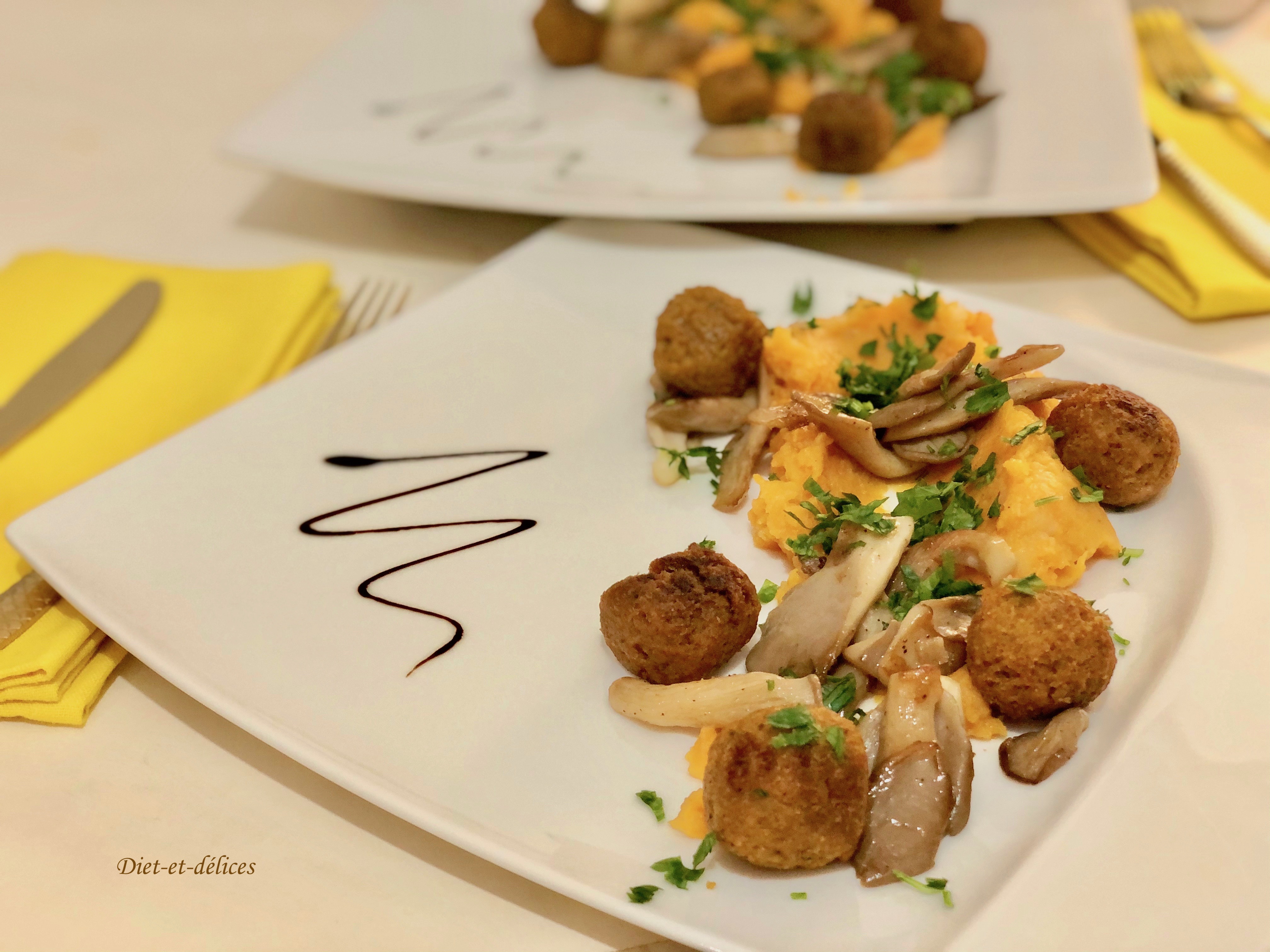 Boulettes végétales, purée de patate douce et poêlée de pleurotes