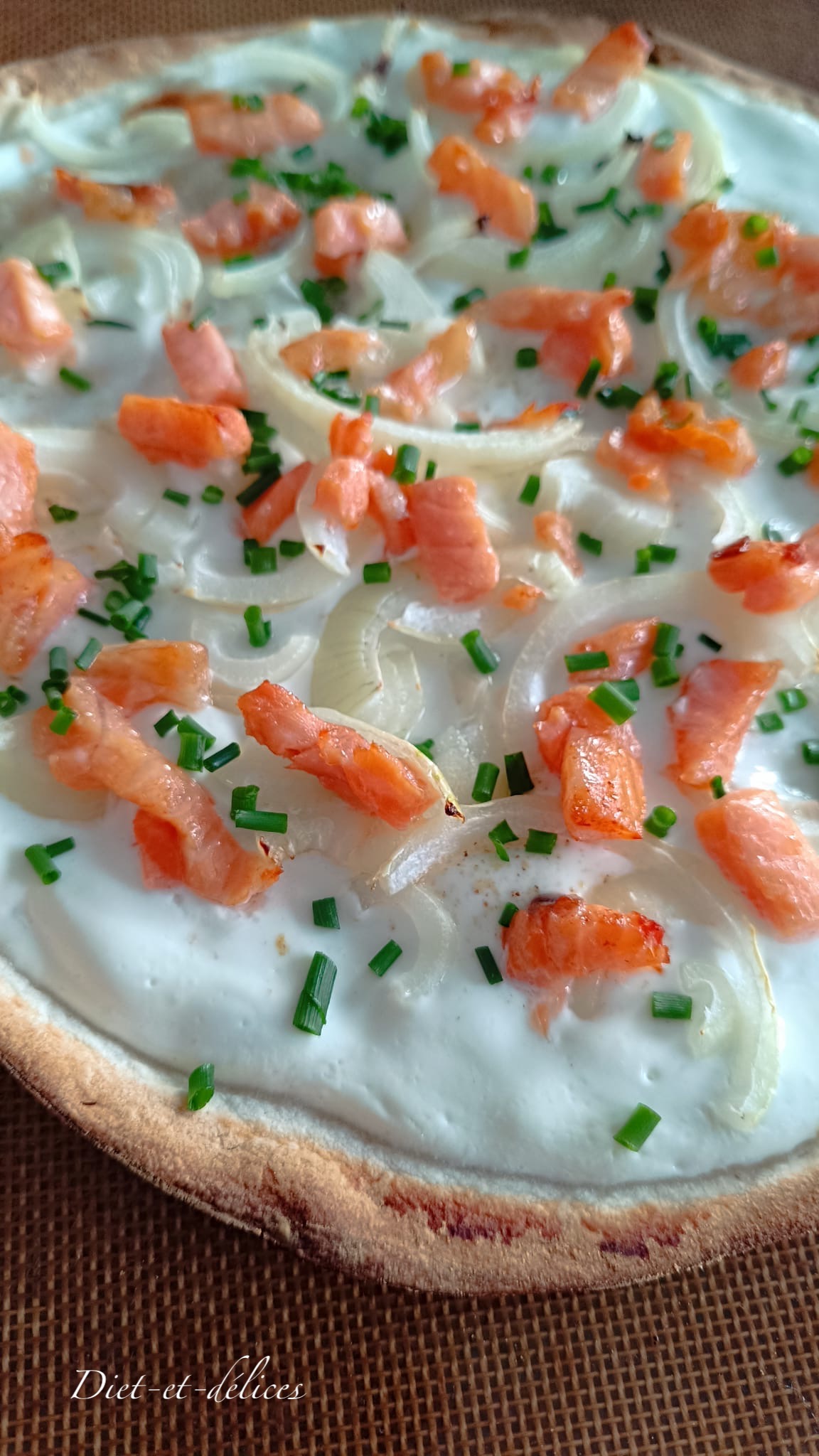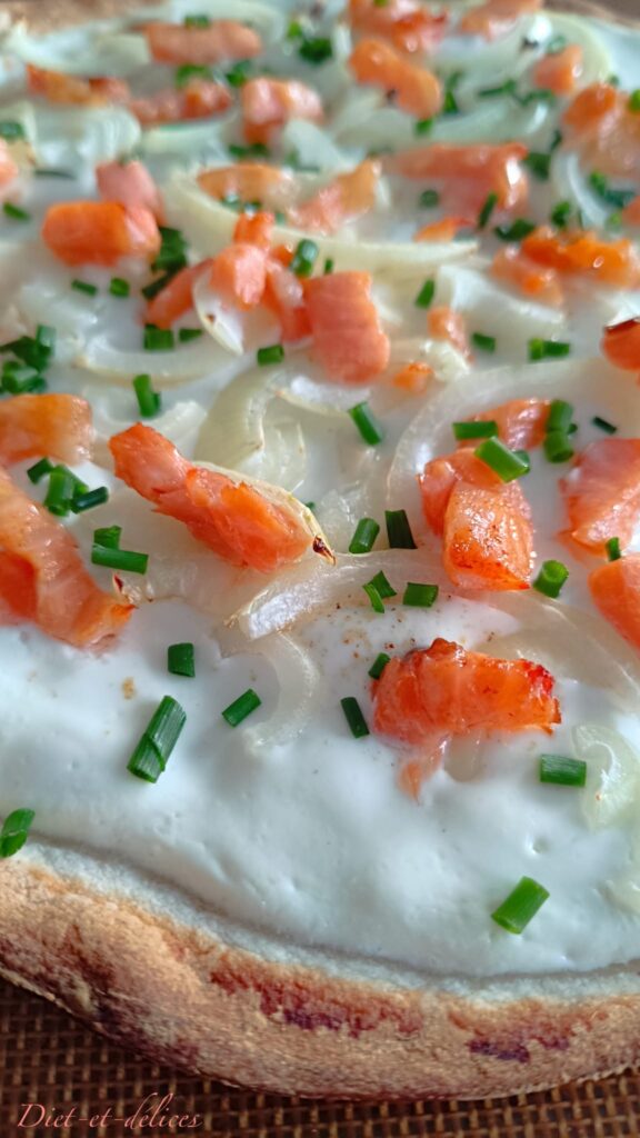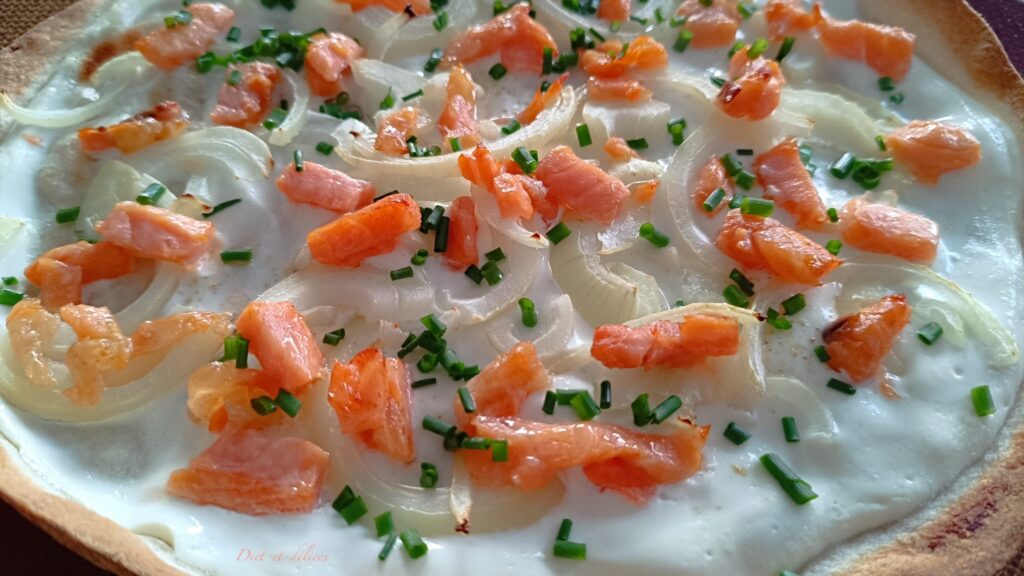 tarte flambée, saumon, saumon fumé tarte flambée au saumon, ciboulette, oignon , plat complet, fromage blanc, cuisine alsacienne