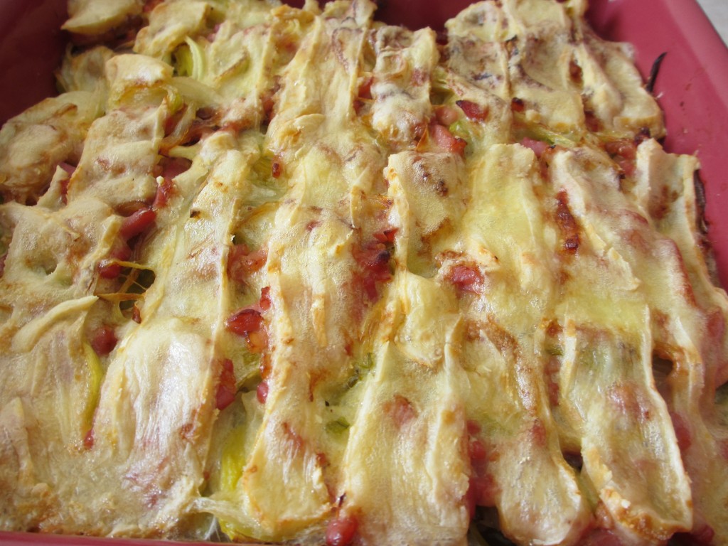 - Dans un plat à gratin, déposer une couche de pommes de terre en rondelles puis une couche de poireaux égouttés.