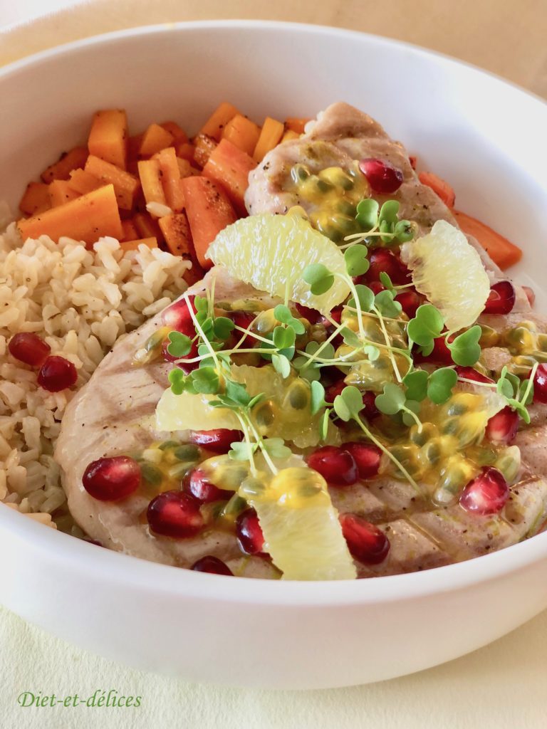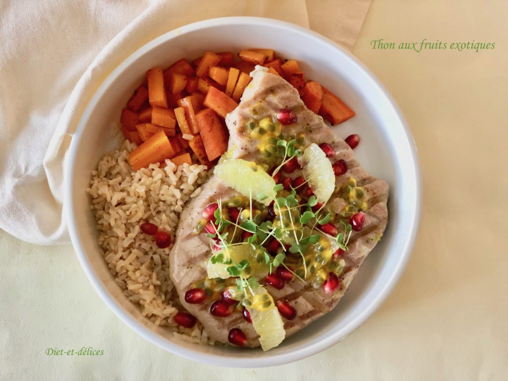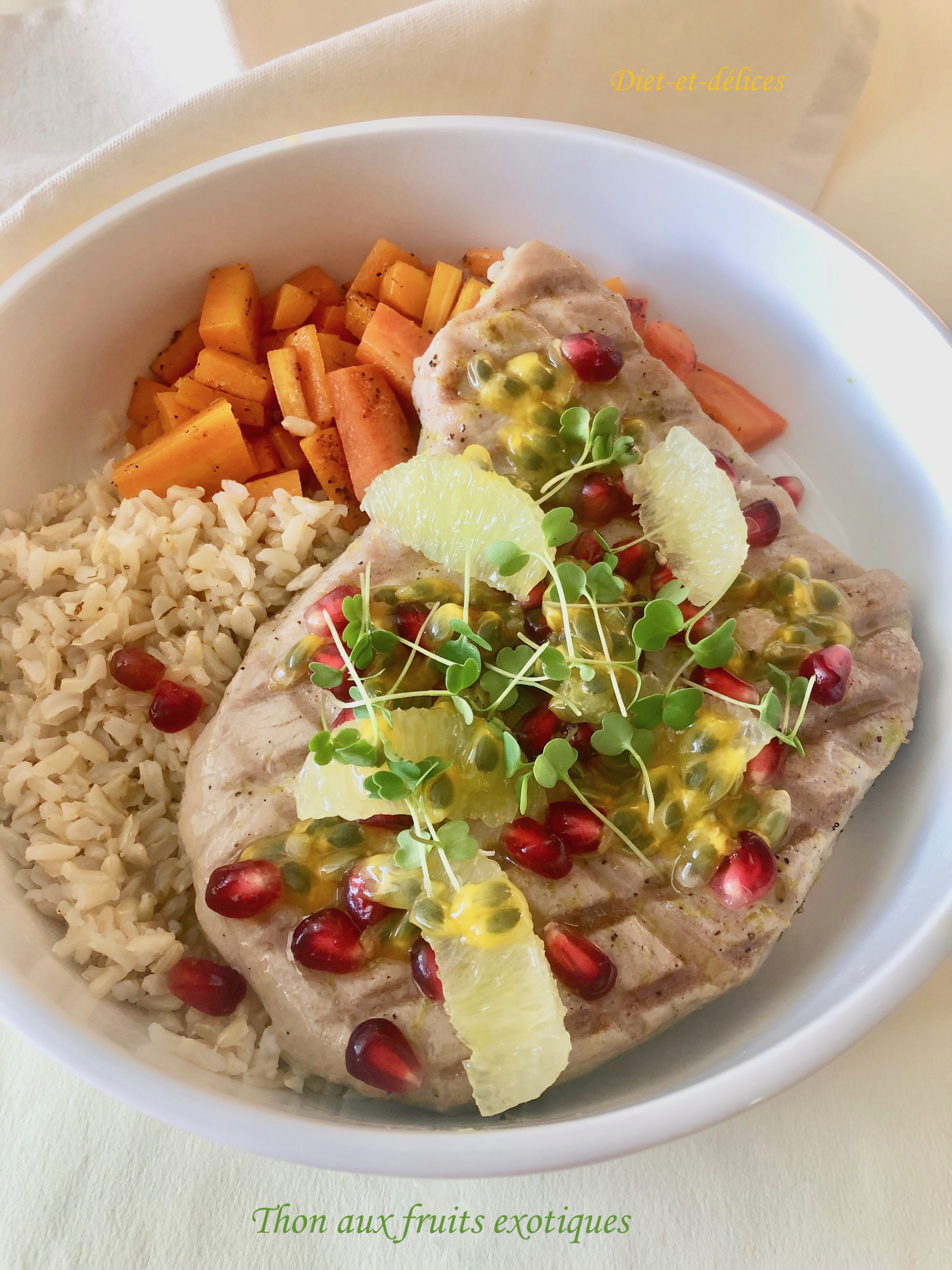 thon, fruits exotiques, sucré salé, grenade, citron vert, fruit de la passion, poisson