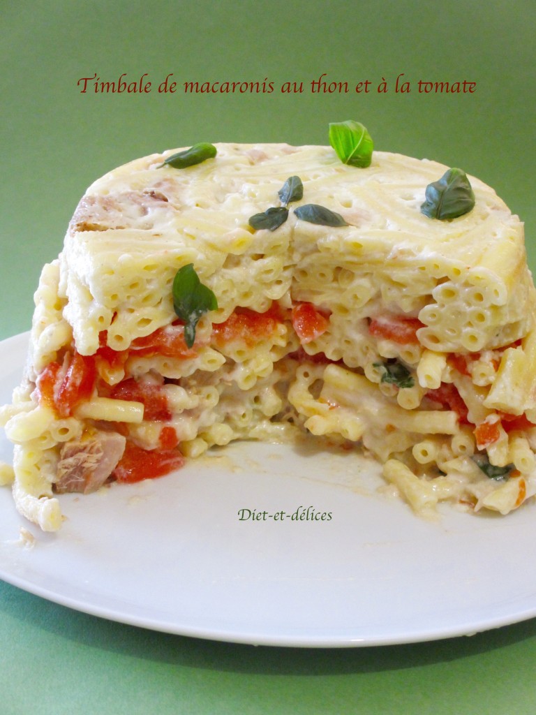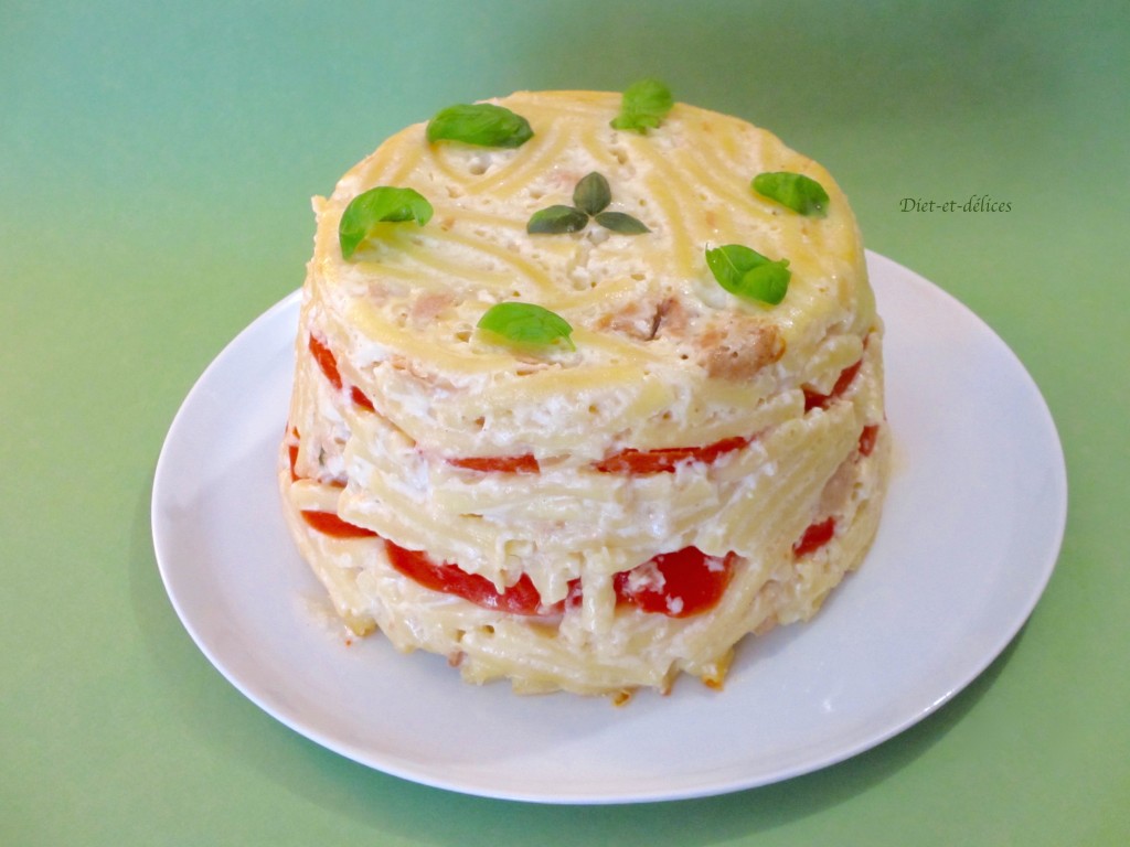 gâteau de pâtes, thon, boîte de thon, gâteau de pâtes au thon, thon appertisé, tomate, timbale de pâtes, béchamel allégée, plat complet, pâtes au thon, basilic