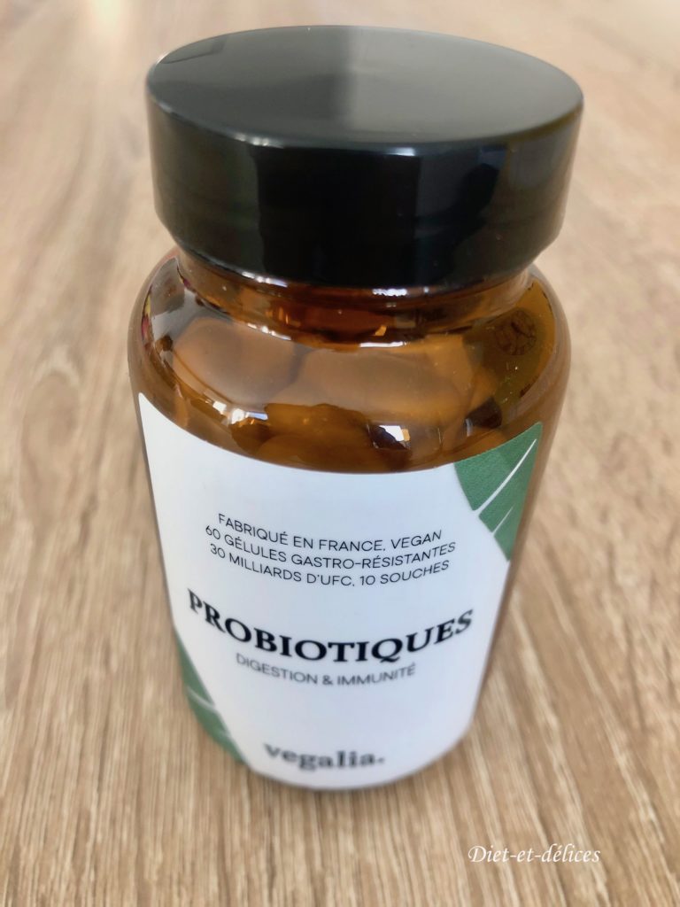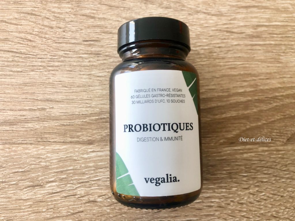 Vegalia a diversifié sa production et propose aussi des probiotiques. Formulés à partir de 30 milliards d’UFC (Unités formant colonies) et de 10 souches sélectionnées et étudiées afin de profiter au mieux des bienfaits. Ils sont destinés à améliorer la digestion (lutter contre les diarrhées, ballonnements, côlon irritable et constipation), l’immunité et à réduire les problèmes cutanés et le stress. Ils sont enveloppés d’une gélule gastro-résistante, ce qui leur permet de n’agir qu’une fois arrivé dans les intestins. Fabriqué en France, 100% Vegan, sans excipient, ils sont vendus dans un flacon en verre.