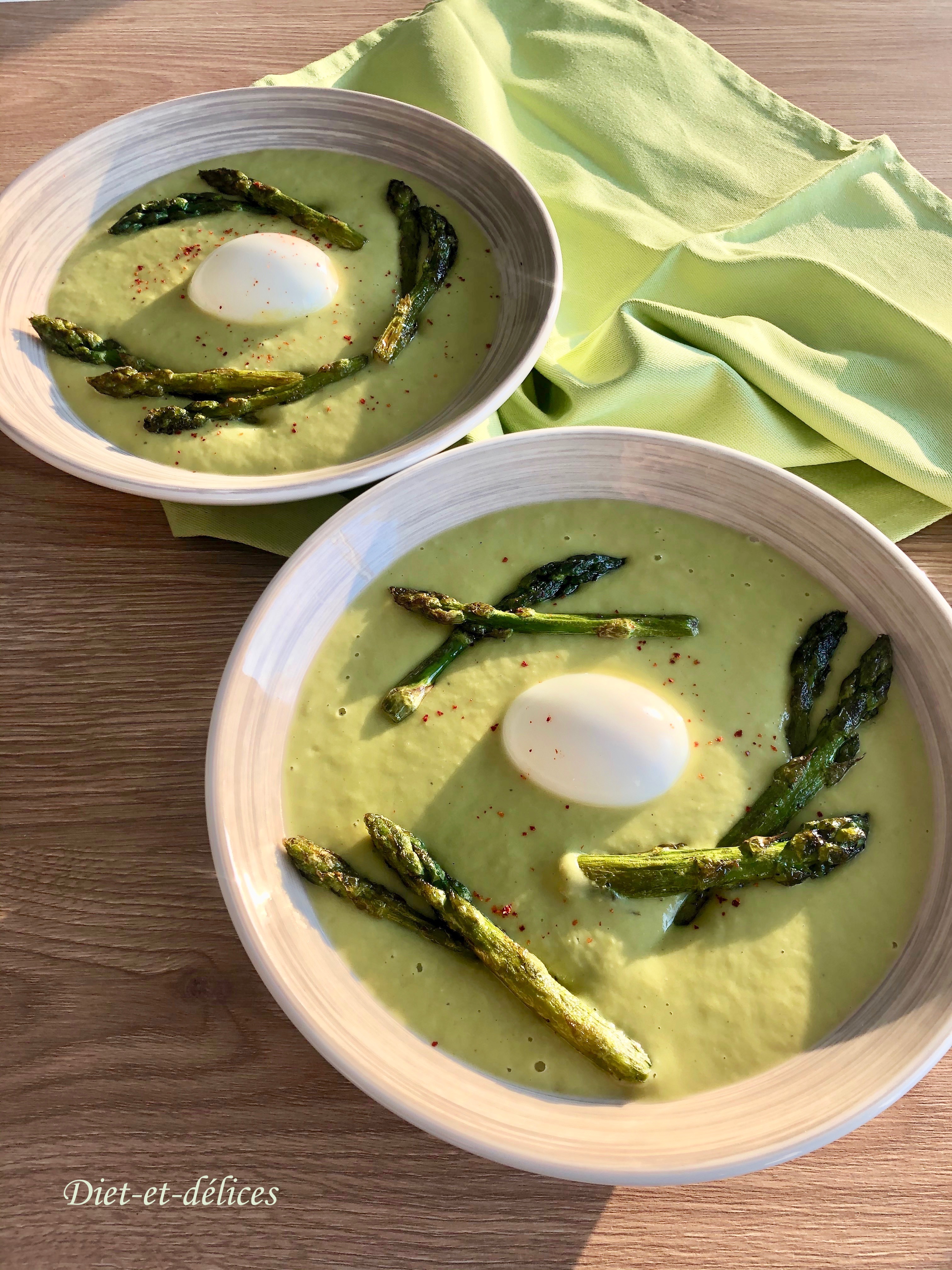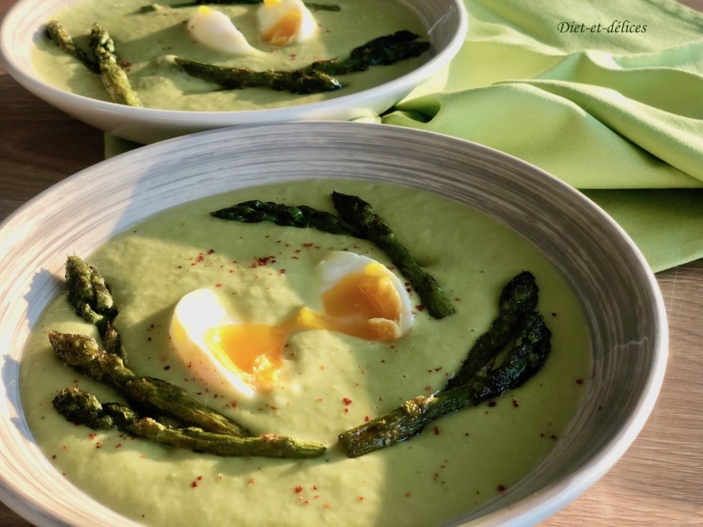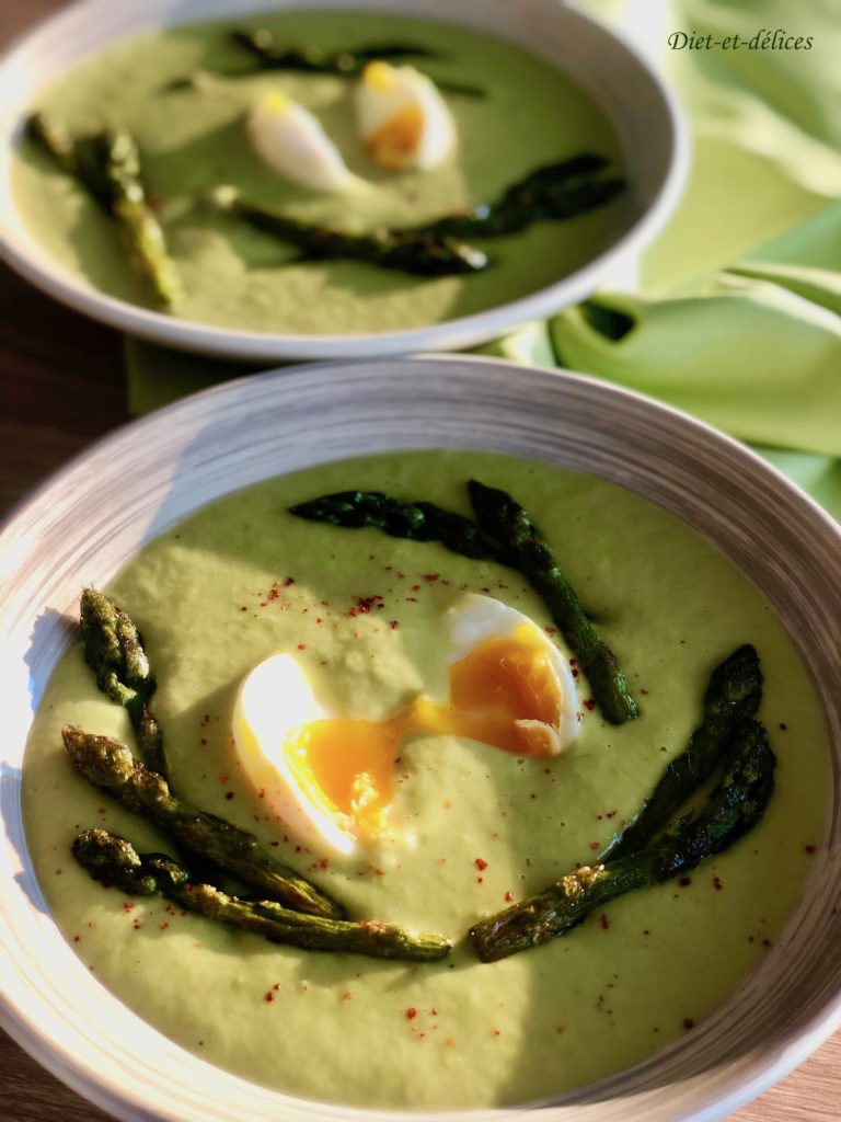 velouté, asperges, oeuf, velouté d’asperges, asperges vertes, oeuf mollet, soupe, pommes de terre, piment d’espelette