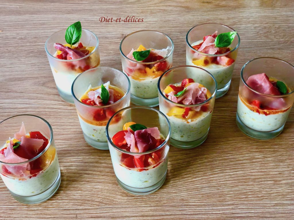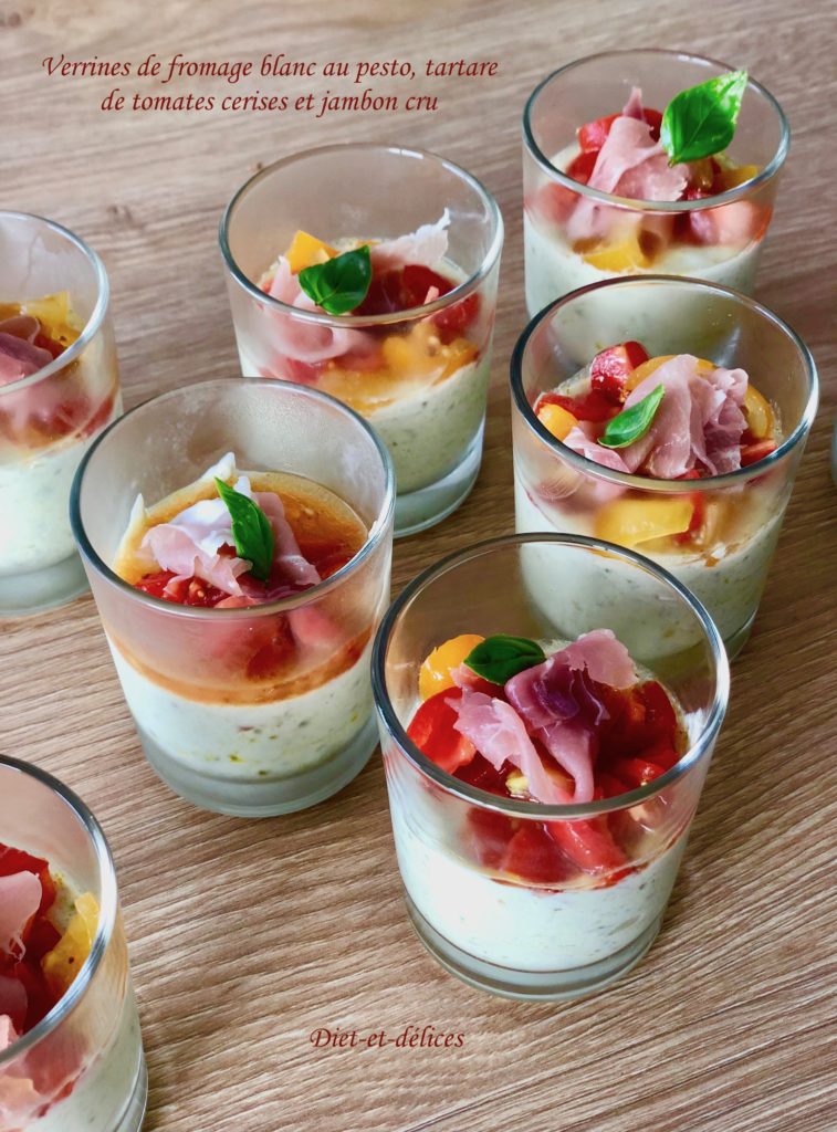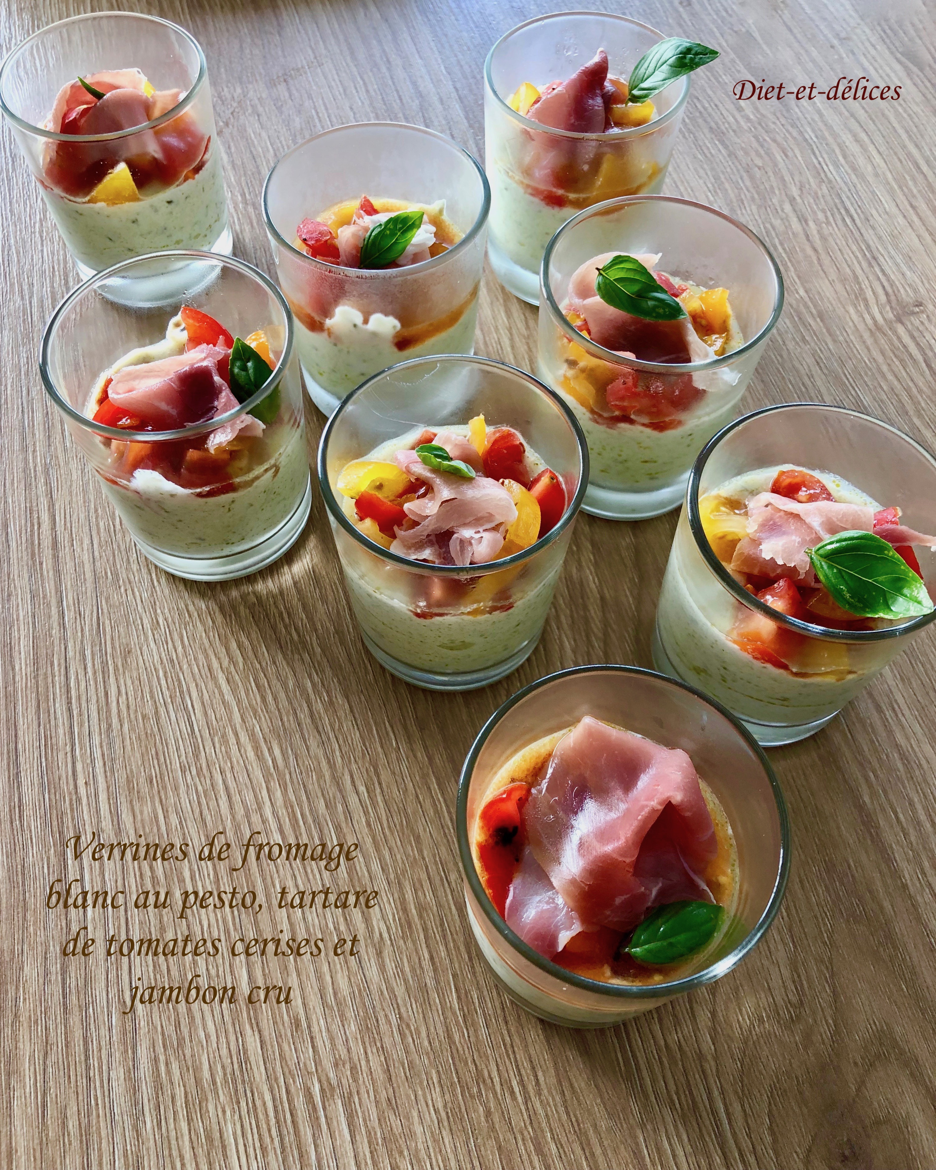 verrines, apéro, apéritif, fromage blanc, pesto, tomates cerises, jambon , jambon cru, basilic