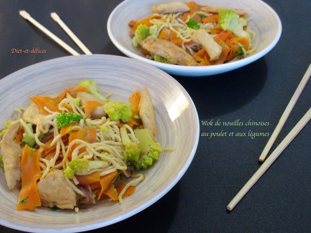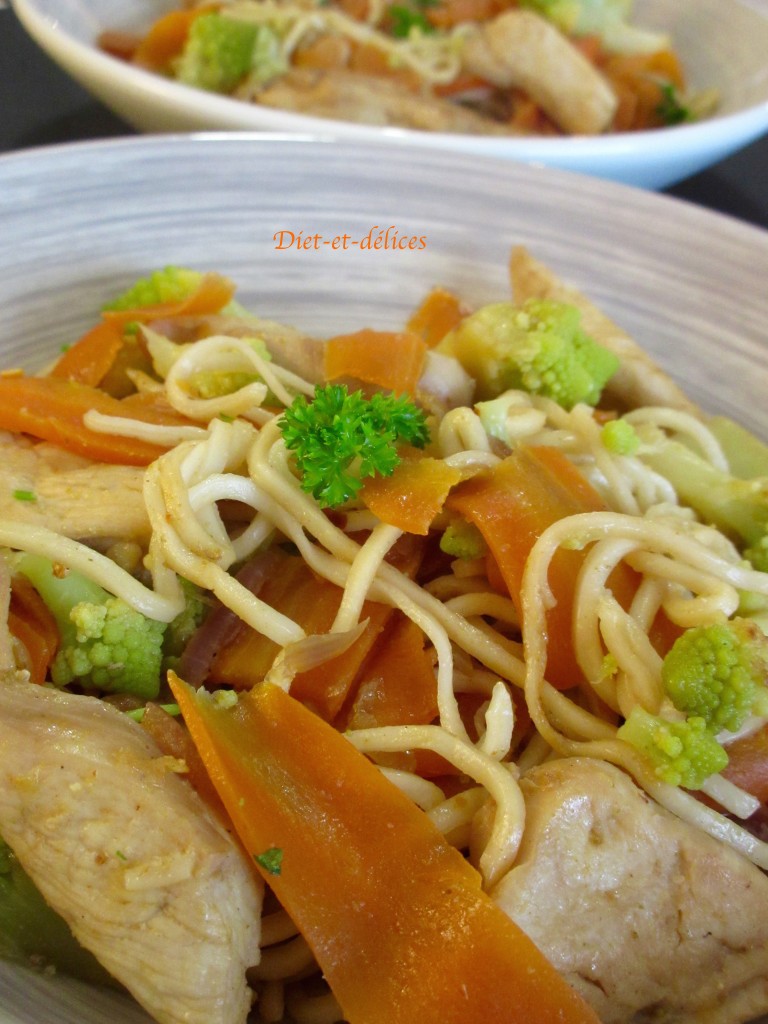 wok, nouilles chinoises, poulet, carottes, piment, sauce soja, cuisine asiatique, chou romanesco, huile de sésame, cumin , gingembre